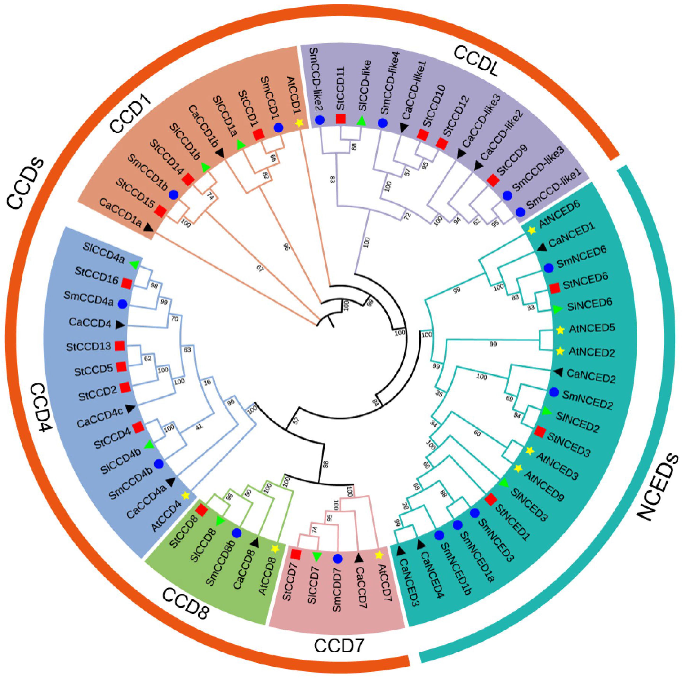 - Wei, Y.; Wan, H.; Wu, Z.; Wang, R.; Ruan, M.; Ye, Q.; Li, Z.; Zhou, G.; Yao, Z.; Yang, Y. A comprehensive analysis of carotenoid cleavage dioxygenases genes in Solanum lycopersicum. Plant Mol. Biol. Rep. 2016, 34, 512–523. [Google Scholar] [CrossRef]
