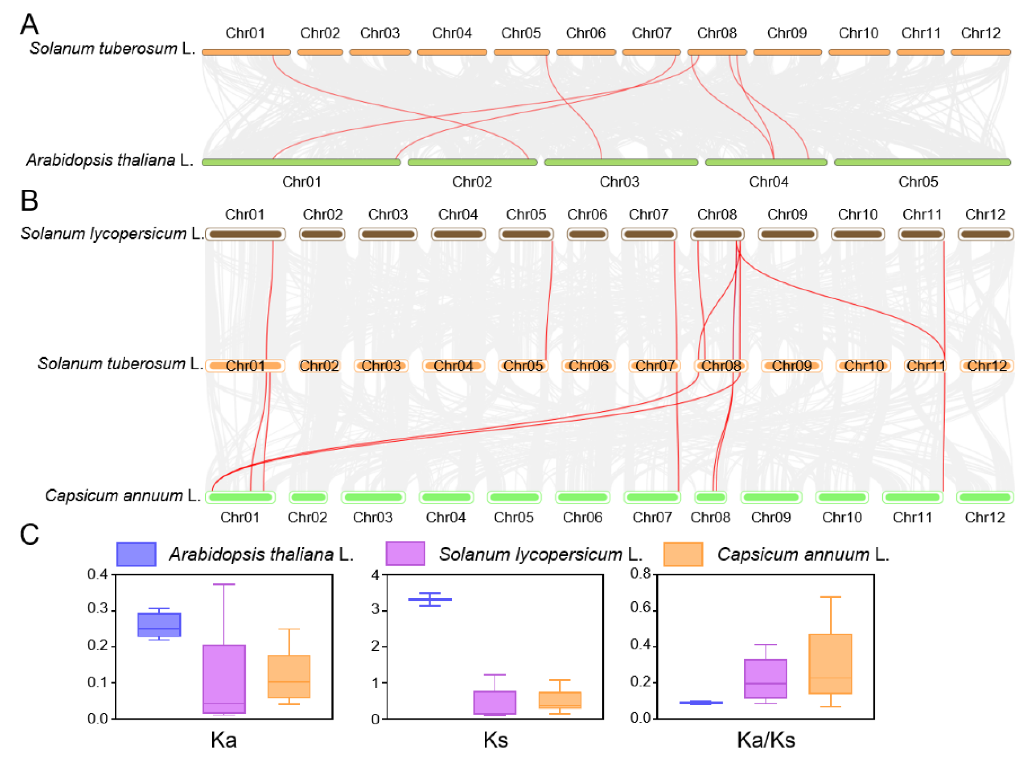 2.6. Synteny Analysis and Chromosome Localization