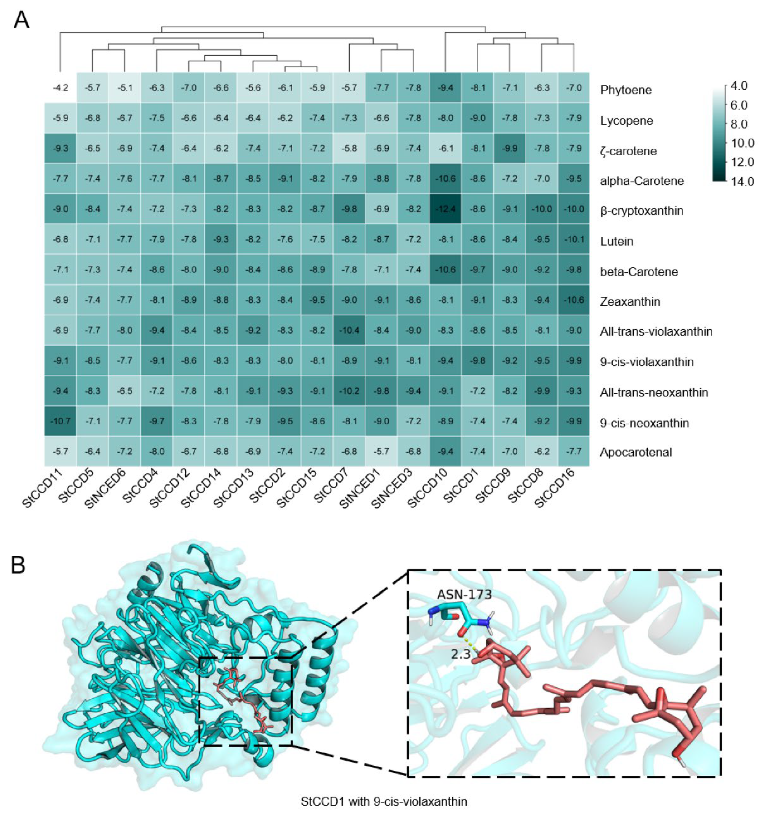 3.6. Molecular Docking for StCCD Proteins and Carotenoids