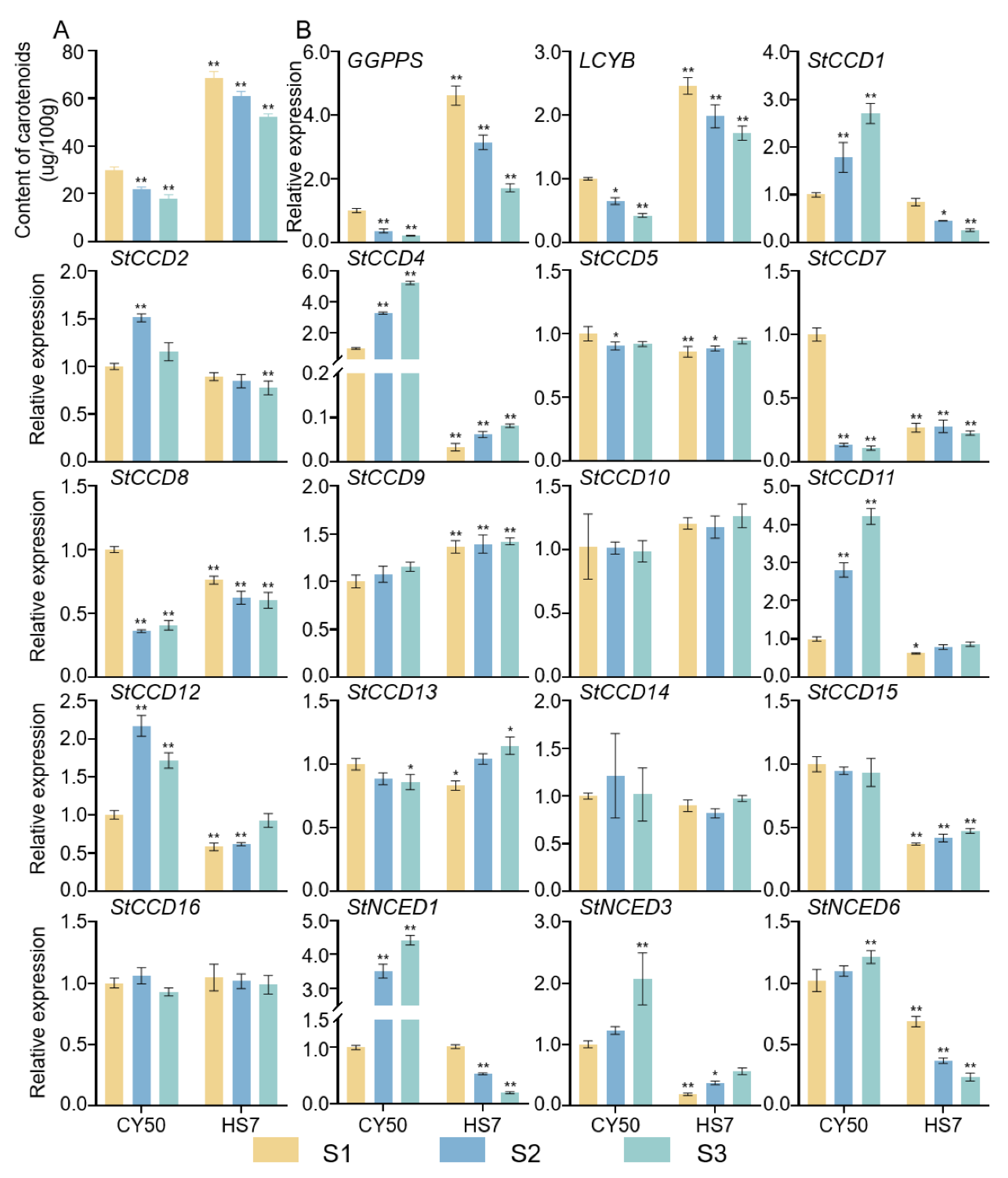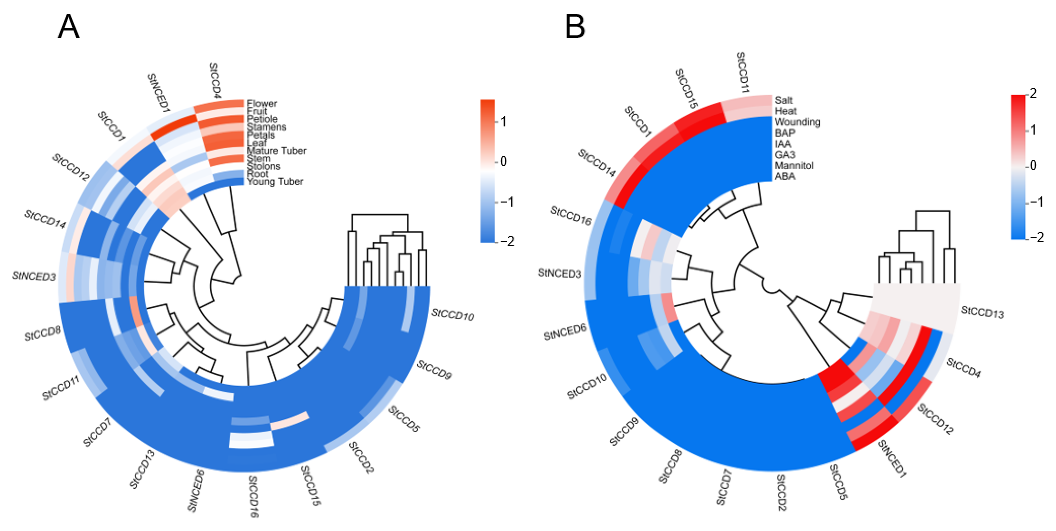 2.8. Expression Pattern Analysis of StCCD Genes in Potato
