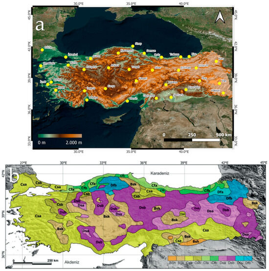 (a) Elevation variations across Turkey and spatial distribution of meteorological stations, as well as (b) the distribution of climate zones across the study area (Öztürk et al. [46]).