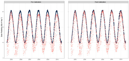 Comparison of measured solar radiation (Rs) against the clear-sky solar radiation (Rso): pre-calibration (left) and post-calibration (right). The solid black line indicates the calculated Rso, representing the theoretical upper limit of Rs under cloud-free conditions.