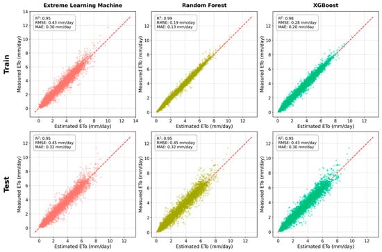 Due to ETo being physically non-negative, any negative ML predictions were processed by setting them to zero (). These negative values occurred only near-zero ETo conditions and represented a negligible fraction of the dataset. For transparency, the frequency of negative raw predictions is reported in Section 4.3. The estimated ETo values ranged from 0.12 to 12.17 mm d−1 for RF, from 0.0 to 12.64 mm d−1 for XGBoost, and from 0.0 to 10.19 mm d−1 for ELM. As shown in Figure 4, the XGBoost model provided the highest accuracy in the testing phase, whereas RF performed best during training. These models yielded the highest R2 values of 0.95 (testing) and 0.99 (training), along with the lowest RMSE and MAE values of 0.43 and 0.30 mm d−1 (testing), and 0.19 and 0.13 mm d−1 (training), respectively. Although ELM exhibited slightly lower performance, it still produced reasonably accurate ETo estimates with RMSE (0.43 mm d−1 for training and 0.45 mm d−1 for testing) and MAE (0.30 mm d−1 for training and 0.32 mm d−1 for testing) values, and a lower R2 value of 0.95 and 0.95 for training and testing, respectively.