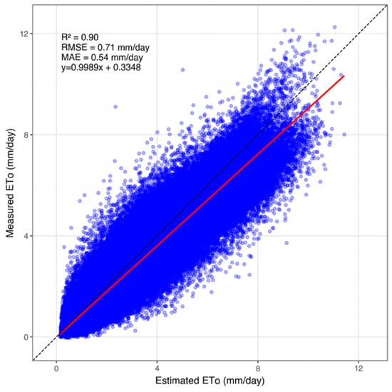 Comparison of estimated vs. measured ETo values. The dashed black line denotes the 1:1 agreement line. The solid red line represents the fitted linear regression line.