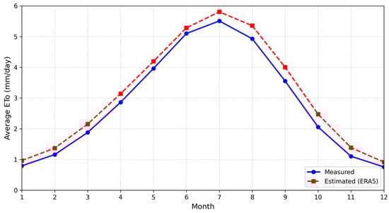 To better understand the ERA5-Land performance under different atmospheric conditions, the data were analyzed on both a monthly and a seasonal basis. Figure 7 presents the long-term mean daily ETo for both datasets across the year. The ERA5-Land product (red dashed line) closely follows the seasonal pattern of ET, reaching its maximum and minimum value in July (5.80 mm day−1) and December (0.91 mm day−1), respectively. Despite the high correlation, there is a systematic difference in certain months. As illustrated in Figure 7, this bias is not uniform over the year. It is minimal in winter months, with differences under 0.20 mm day−1, but increases substantially during the late-summer to autumn transition.