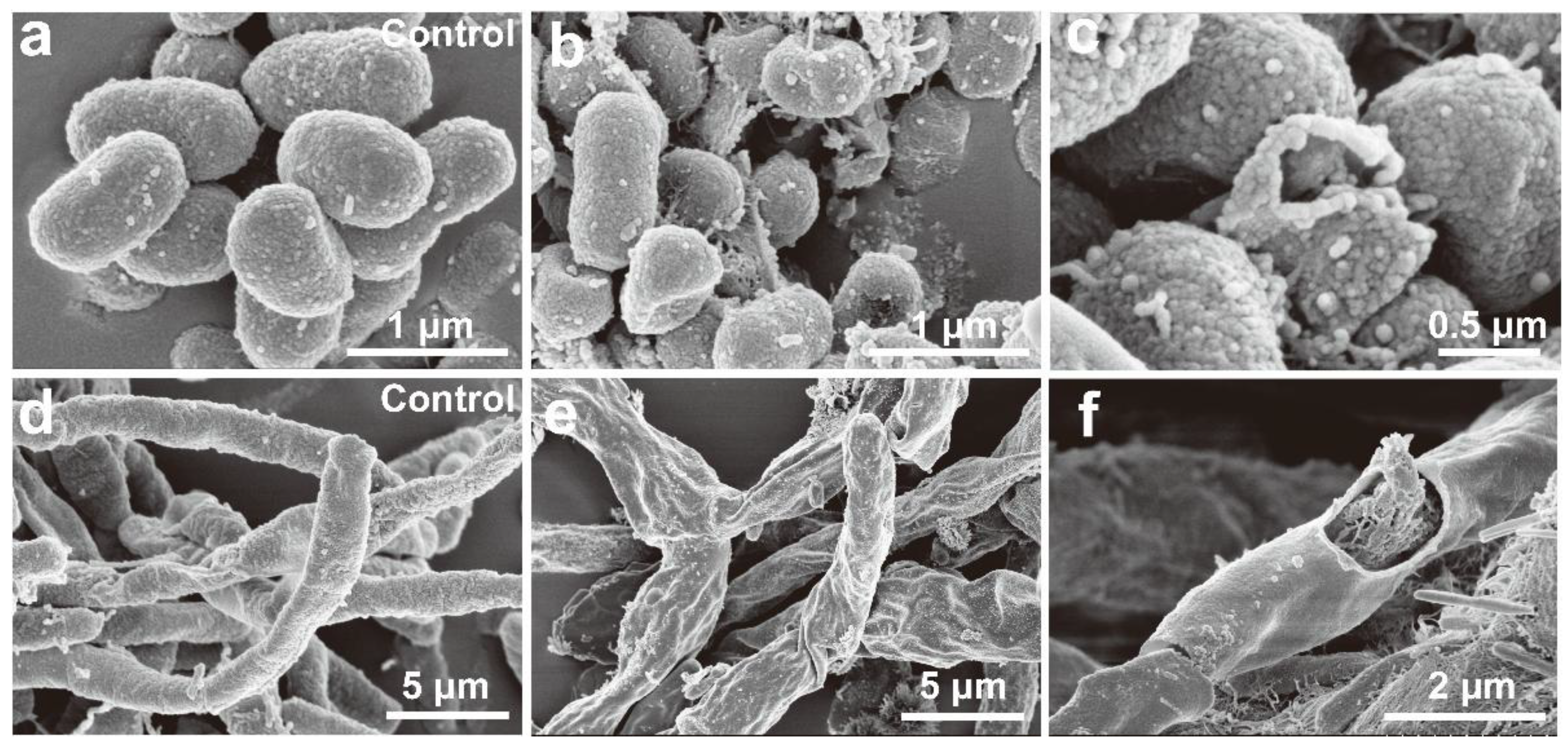 - Mao, C.; Xiang, Y.; Liu, X.; Zheng, Y.; Yeung, K.W.K.; Cui, Z.; Yang, X.; Li, Z.; Liang, Y.; Zhu, S.; et al. Local Photothermal/Photodynamic Synergistic Therapy by Disrupting Bacterial Membrane To Accelerate Reactive Oxygen Species Permeation and Protein Leakage. ACS Appl. Mater. Interfaces 2019, 11, 17902–17914. [Google Scholar] [CrossRef]