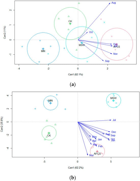 Discriminant canonical analysis of soil microbial biomass in 2023 (a) and in 2024 (b). Data measured in March 2023 were not included since treatments were not yet applied.