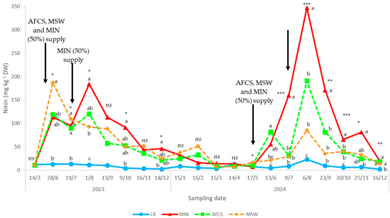 Effect of fertilization treatment (CK = unfertilized control; MIN = mineral fertilization; MSW = municipal solid waste compost; AFCS = compost from agri-food chain scraps) on mineral N availability during the experiment. ns, *, **, ***: effect not significant or significant at P ≤ 0.05, 0.01, and P ≤ 0.001, respectively. Within the same date, values followed by the same letter are not statistically different according to the SNK test (P = 0.05).