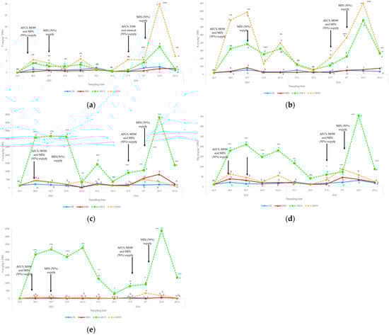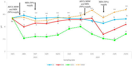 The supply of AFCS induced, during the entire experiment, the lowest soil pH values. MIN showed a pH lower than MSW and the control in June 2023 and in July, September, and November 2024; in the latter sampling date, MSW also showed values lower than the control (Figure 4).