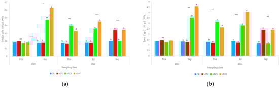 In September 2023, three months after the first amendment supply, MSW induced a significant increase in total N and C in comparison to MIN and CK, while AFCS showed, for both elements, intermediate values not different from the other treatments (Figure 5). From March 2024, both amendments, induced a significant increase in soil total N (Figure 5a) and C, which, in July 2024, was significantly higher in MSW than in AFCS (Figure 5b). In September 2024, MIN and MSW showed significantly higher total C and N soil concentrations than AFCS and CK (Figure 5).