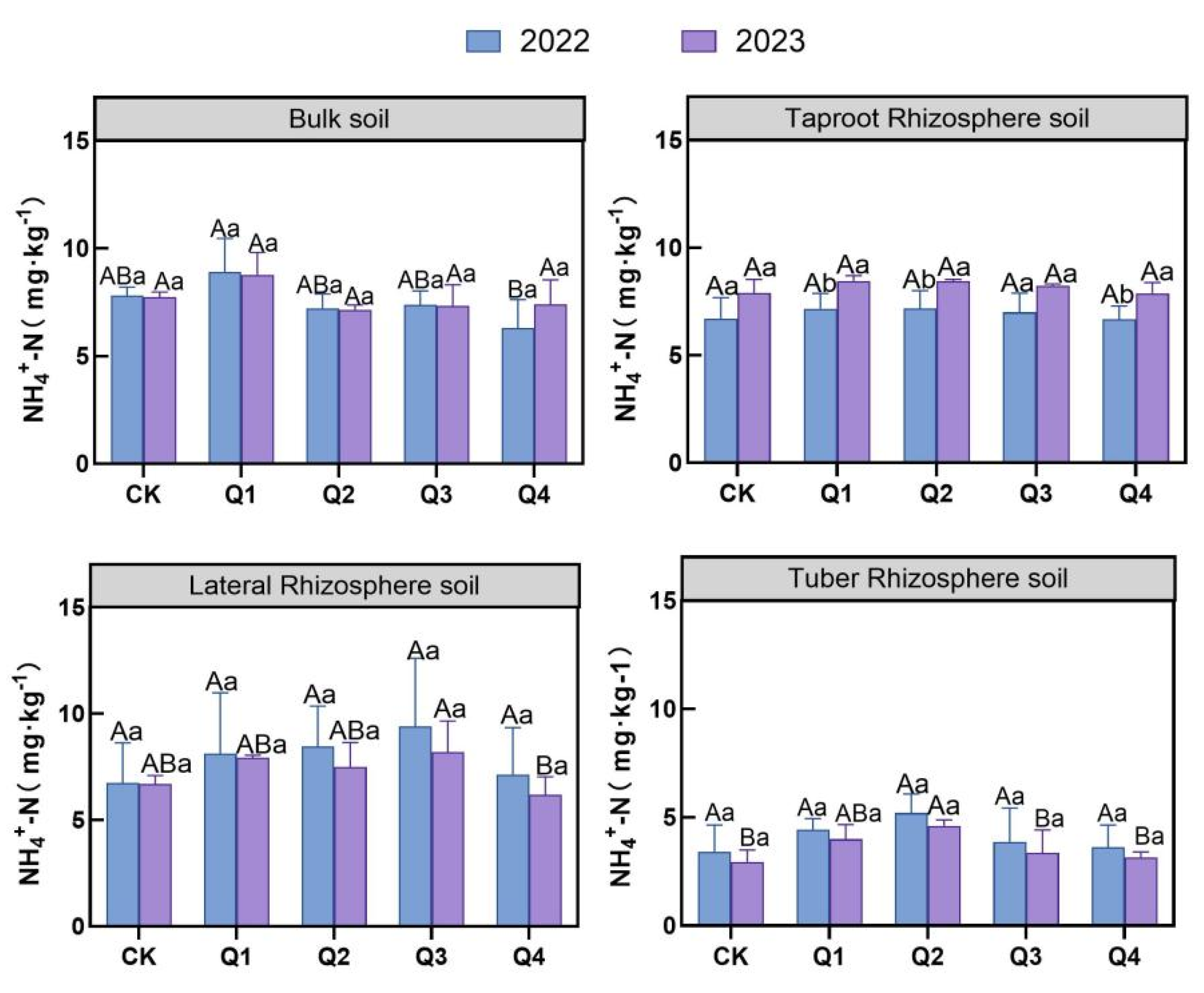 | Ammonium Nitrogen | Bulk soil | Year × treatment | 4 | 0.475 | p > 0.05 |