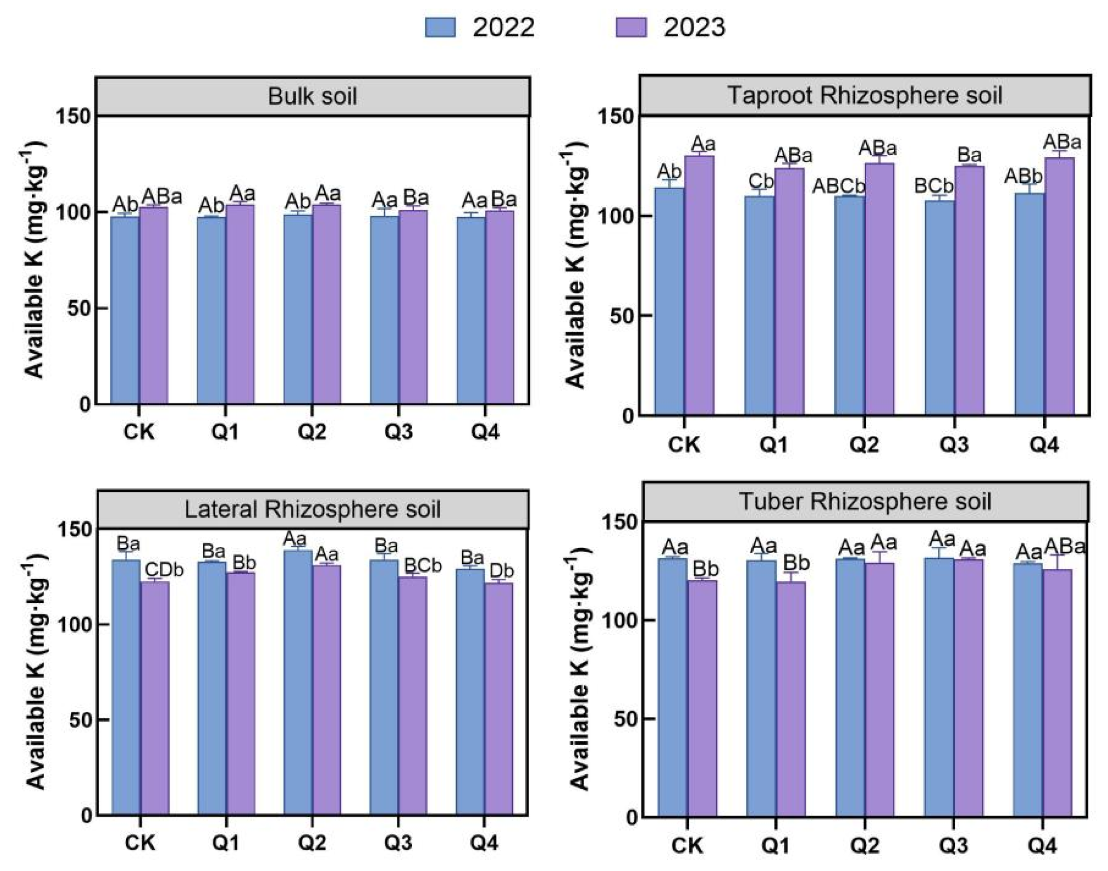 | Available Potassium | Bulk soil | Year × treatment | 4 | 0.837 | p > 0.05 |