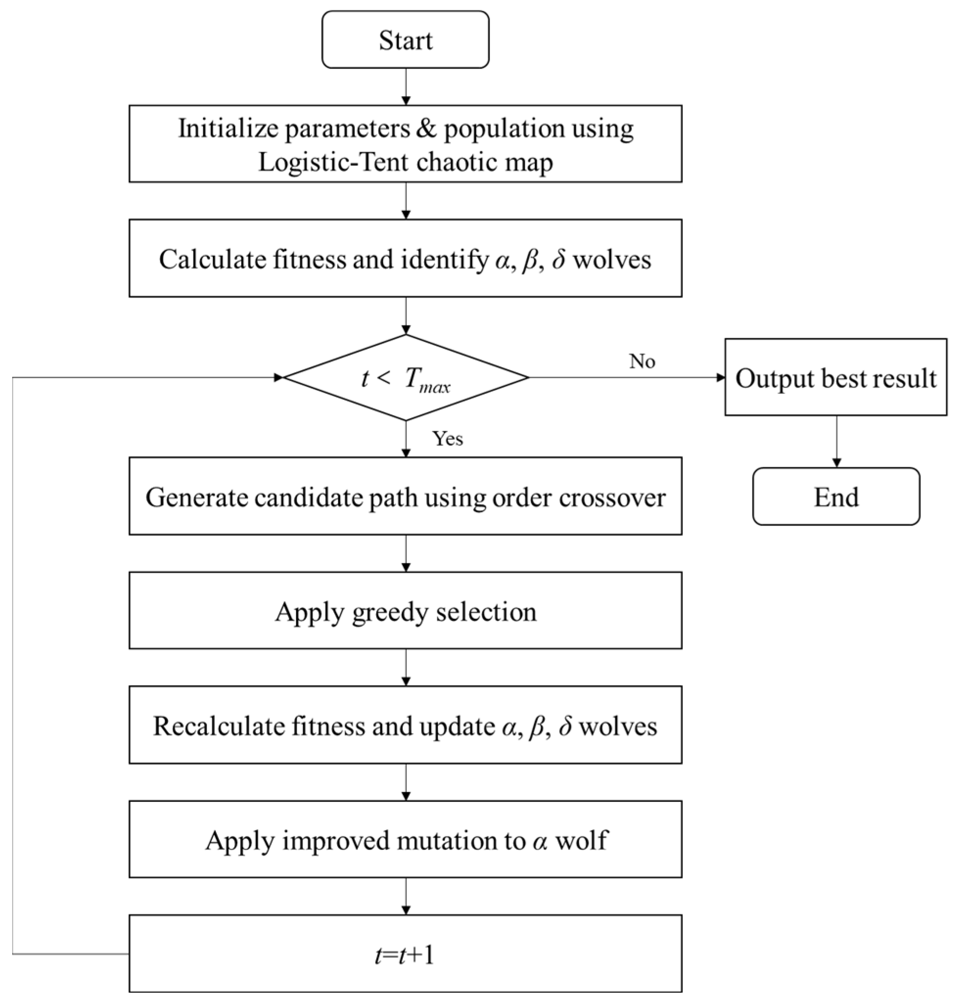 - The fitness values of all individuals were calculated and updated. The α, β, and δ wolves were reselected.