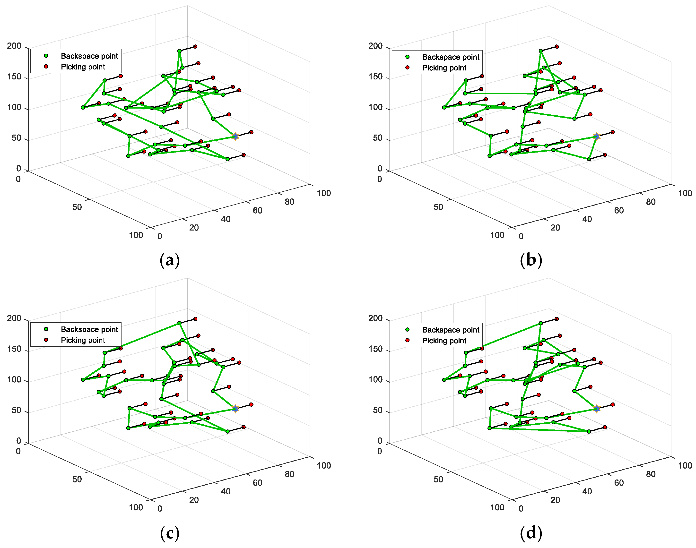 - Zhang, C.; Wang, H.; Fu, L.H.; Pei, Y.H.; Lan, C.Y.; Hou, H.Y.; Song, H. Three-Dimensional Continuous Picking Path Planning Based on Ant Colony Optimization Algorithm. PLoS ONE 2023, 18, e0282334. [Google Scholar] [CrossRef]