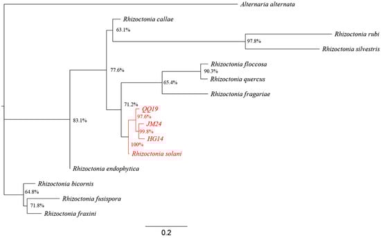 Representative strains QQ19, JM24, and HG14, which are typical strains with strong virulence, preliminarily identified as R. solani based on morphology, were further characterized molecularly. Genomic DNA was extracted from each isolate and amplified by PCR using the primer pairs ITS1/ITS4, NL1/NL4, and NS1/NS8. Resulting sequences were subjected to BLAST analysis against the NCBI database, revealing >95% identity with reference sequences of R. solani (accessions EU591769.1 for ITS, MH874361.1 for NL, and D85633.1 for NS). To clarify phylogenetic relationships, a multi-locus phylogenetic tree was constructed using concatenated sequences from various Rhizoctonia species, with Alternaria alternata as the outgroup. The tree was visualized using FigTree v1.4.4. Phylogenetic analysis confirmed that QQ19, JM24, and HG14 clustered within a well-supported clade containing reference R. solani strains (Figure 2). The sequences generated in this study were deposited in GenBank under accession numbers PX735937–PV735939 (ITS), PV366567–PV366569 (NL1/NL4) and PV361227–PV361229 (NS1/NS8).