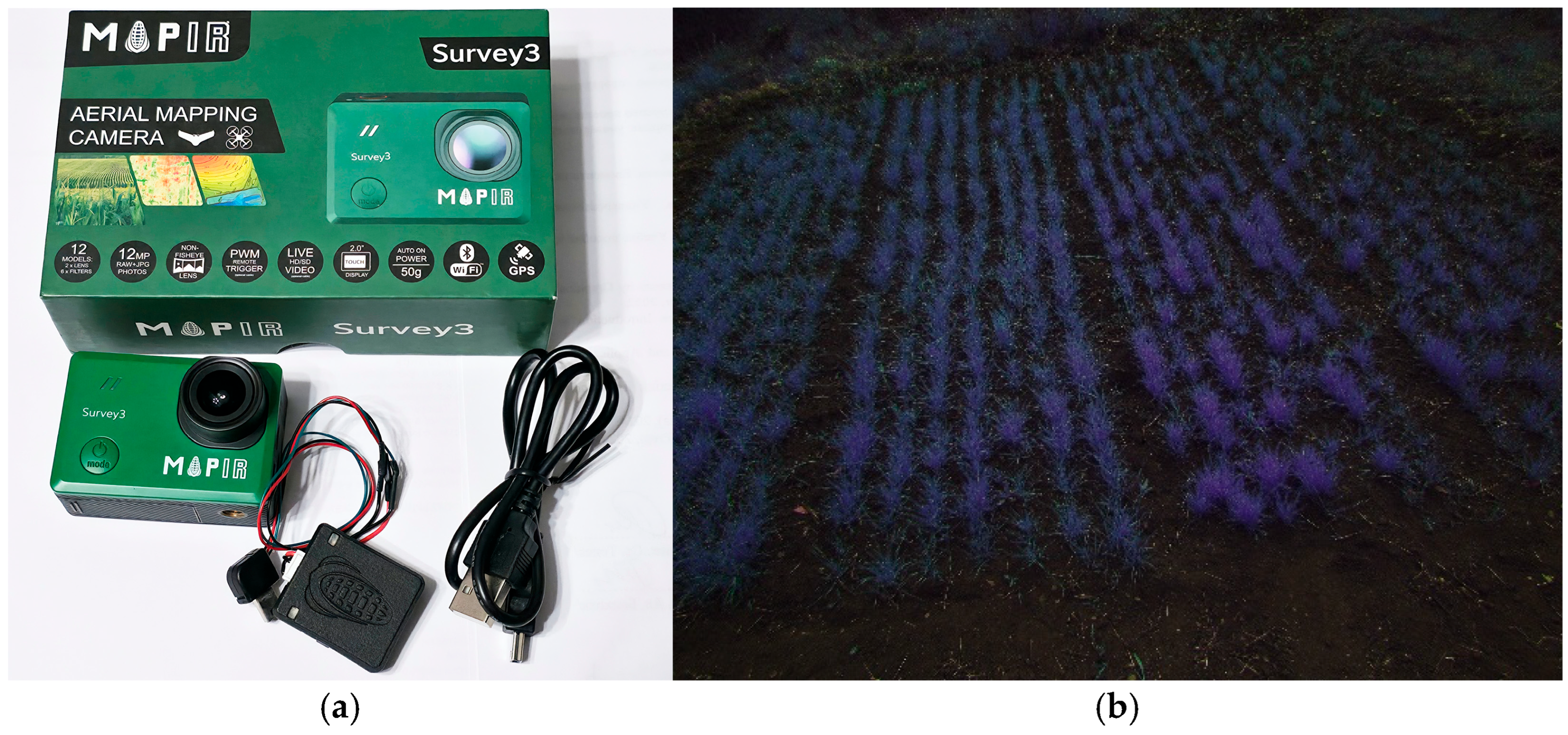 - Mapir. Available online: https://www.mapir.camera/en-gb/collections/survey3/products/survey3w-camera-red-green-nir-rgn-ndvi (accessed on 10 August 2025).