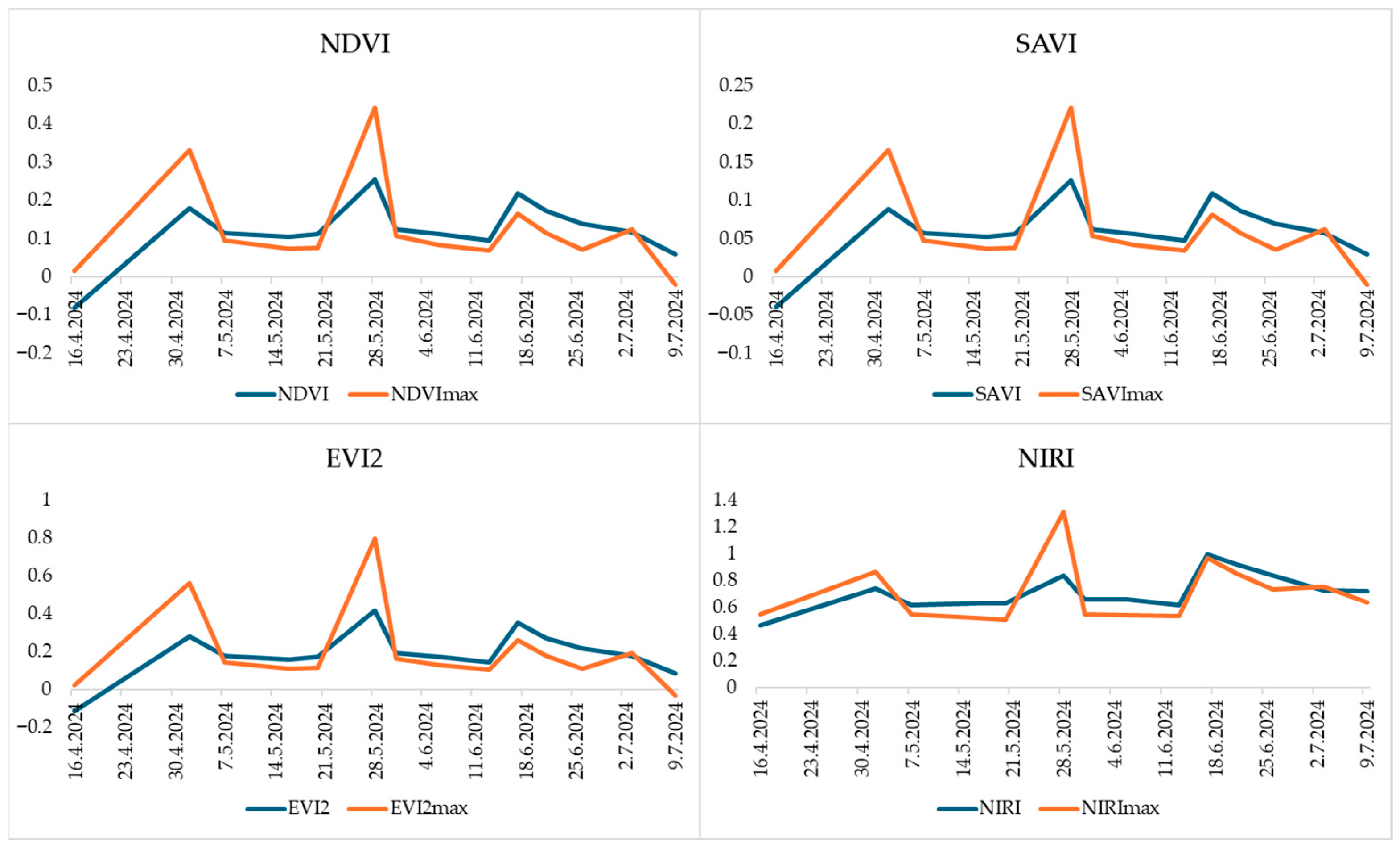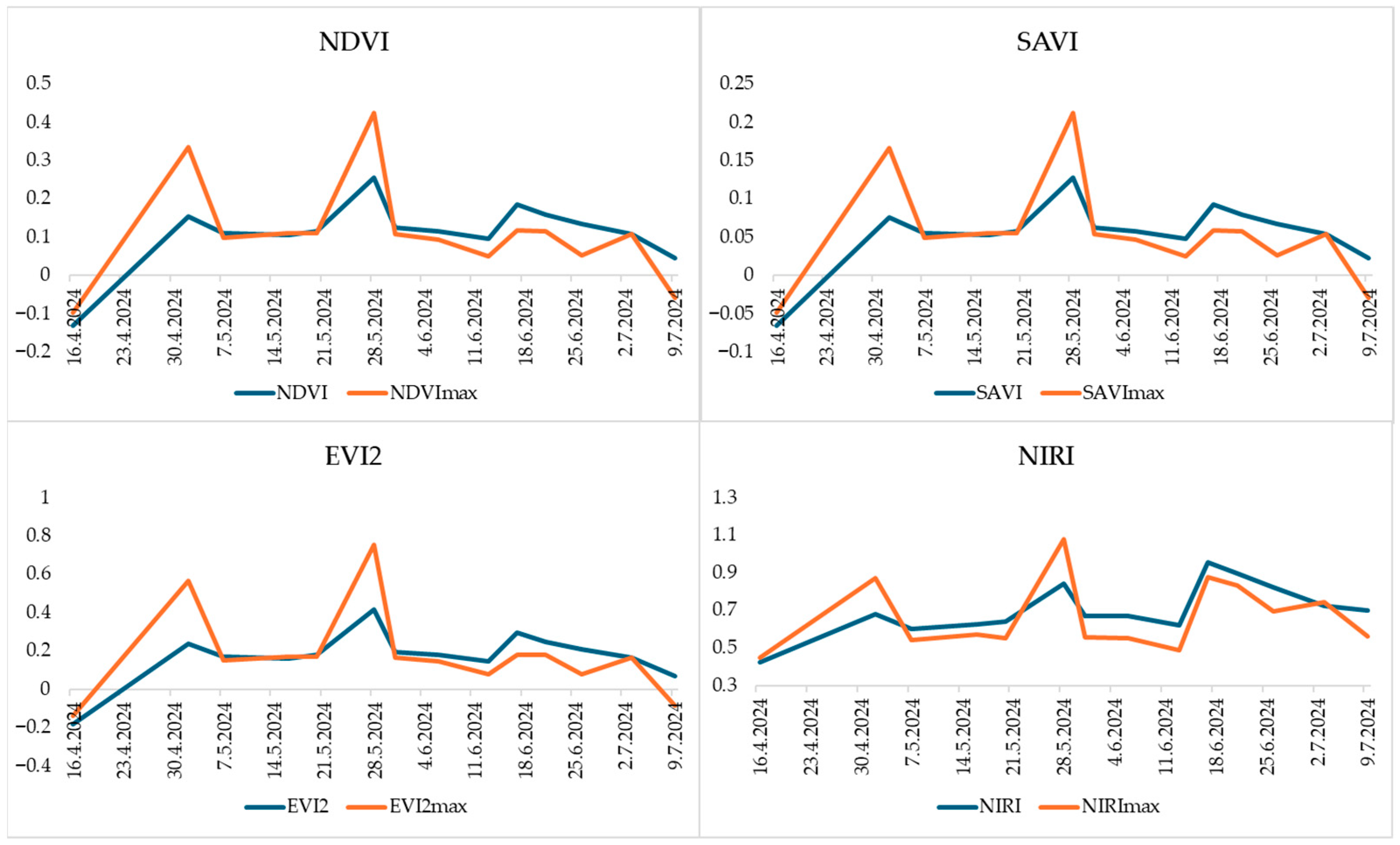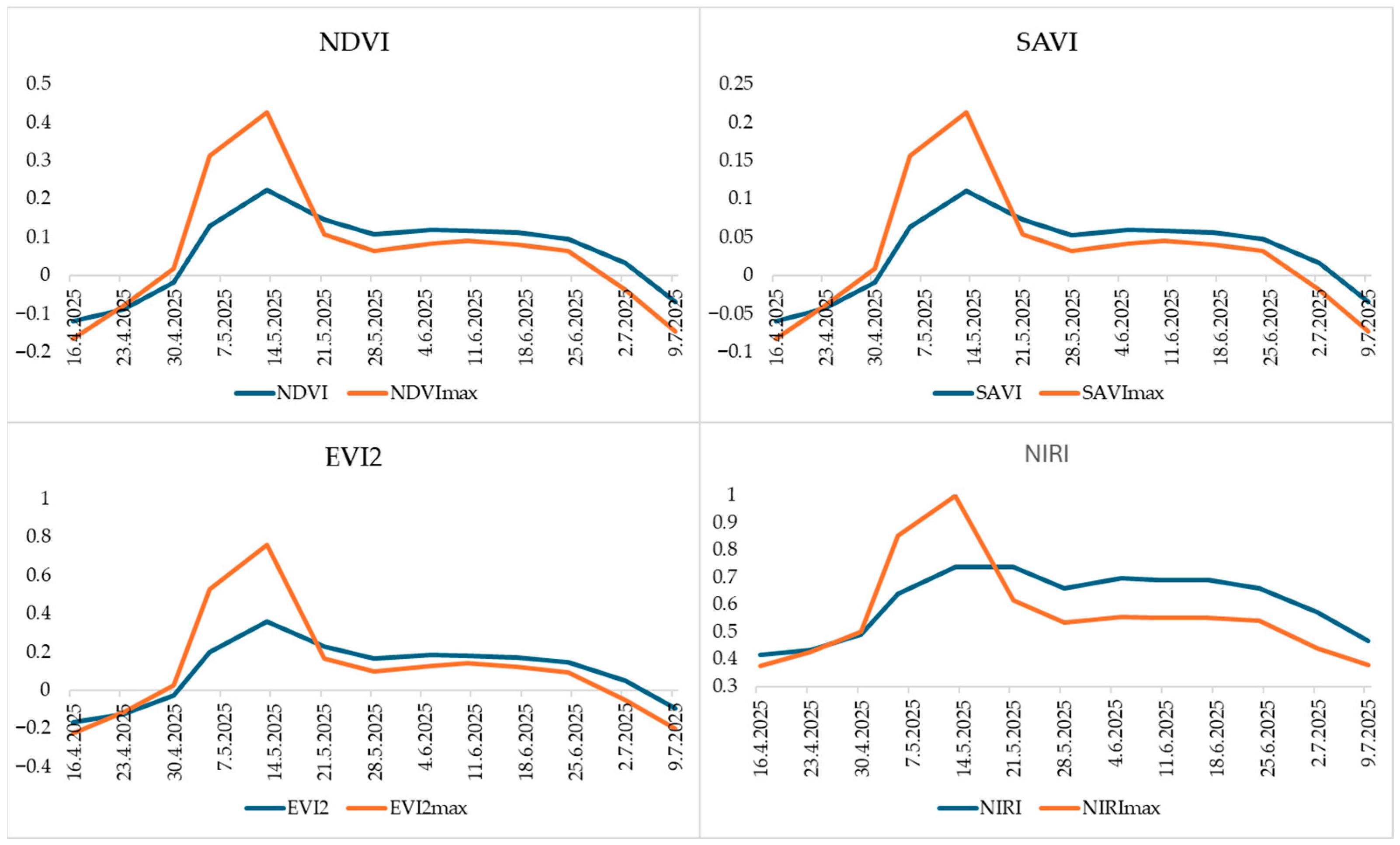- Atanasov, A. A drone-based study on the possibilities of agricultural crop assessment using reflectance index in NIR. Bulg. J. Agric. Sci. 2024, 30, 1136–1140. [Google Scholar]