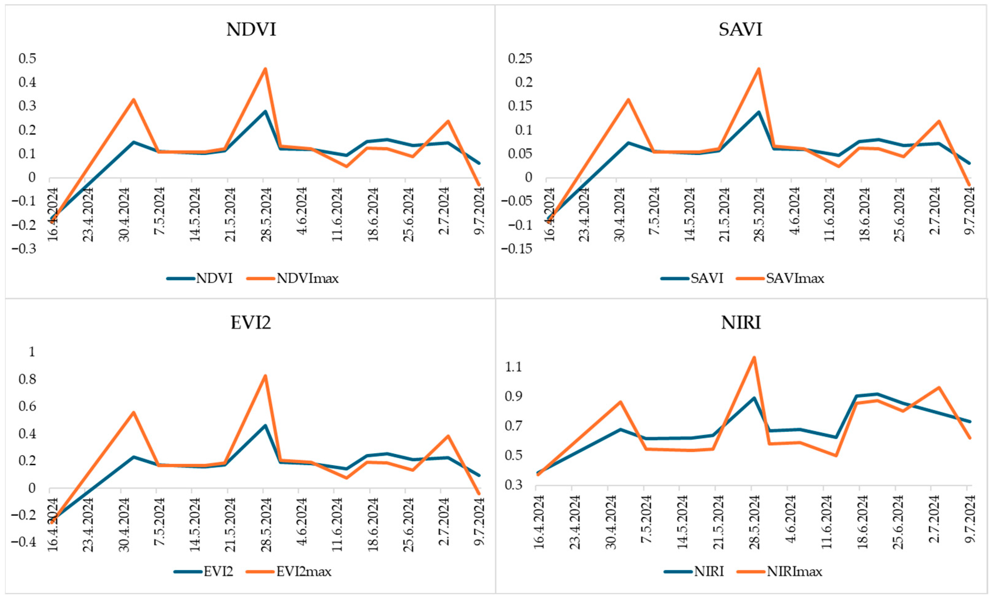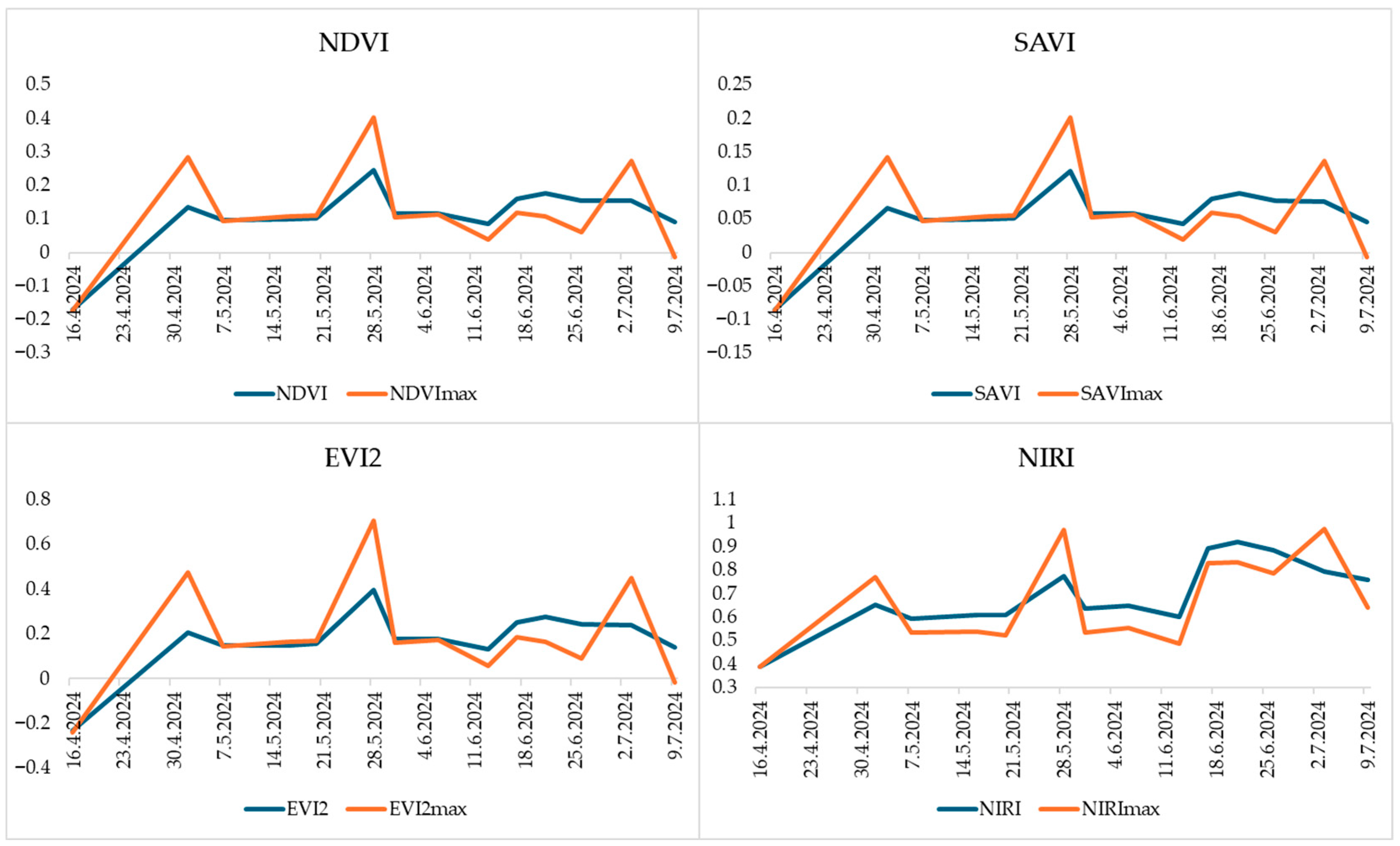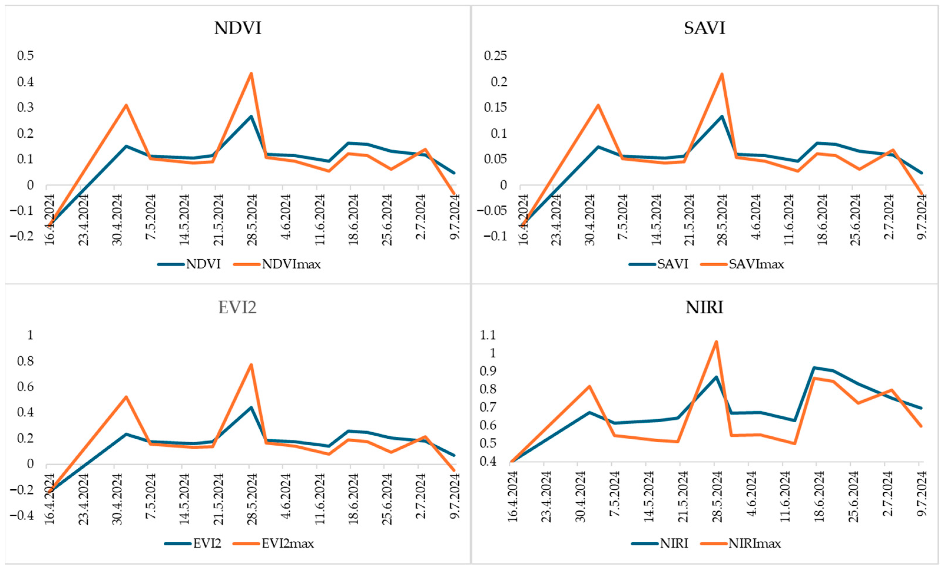 - Atanasov, A. A drone-based study on the possibilities of agricultural crop assessment using reflectance index in NIR. Bulg. J. Agric. Sci. 2024, 30, 1136–1140. [Google Scholar]