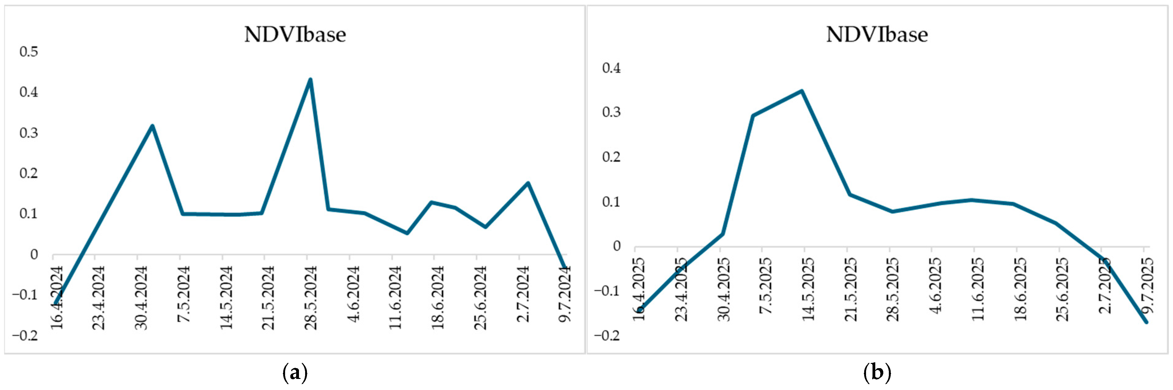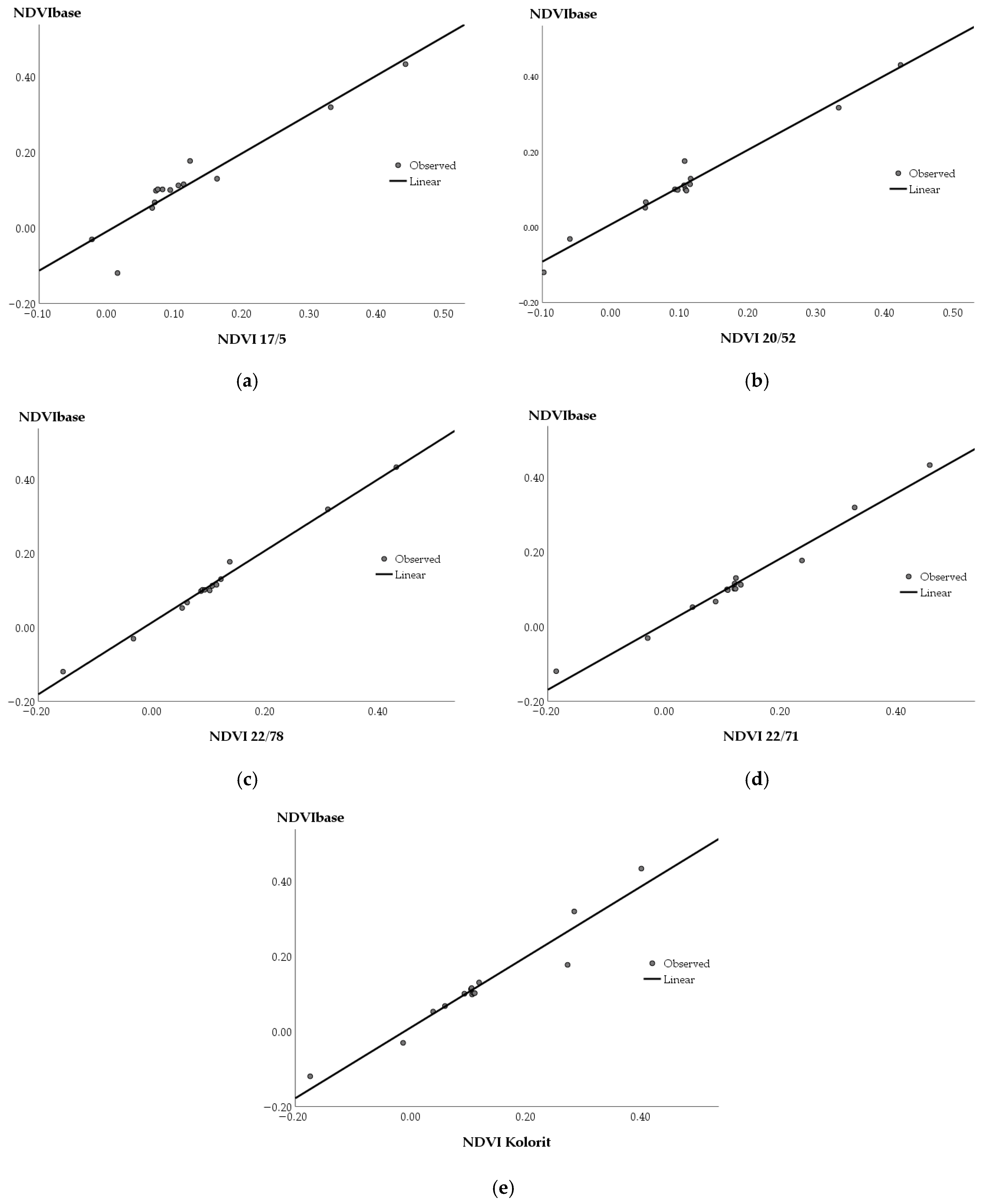 | Pearson Correlation | NDVIbase | 1.000 | 0.946 | 0.986 | 0.996 | 0.989 | 0.968 |