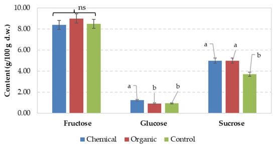 Both fructose and sucrose were positively influenced by organic fertilization (Figure 3), whereas the chemical treatment resulted in higher overall glucose and sucrose contents than the unfertilized control.