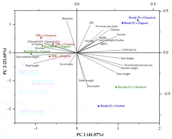 The ABTS and DPPH values detected in the sweet corn varieties are consistent with the findings of Cai et al. [71] and Bae et al. [75], who also reported that ABTS values were higher than those of DPPH, aligning with the trend observed in this analysis. Furthermore, similar to our findings, Dragičević et al. [76] reported a higher DPPH radical scavenging activity in maize genotypes under chemical fertilization compared to organic and unfertilized regimes.