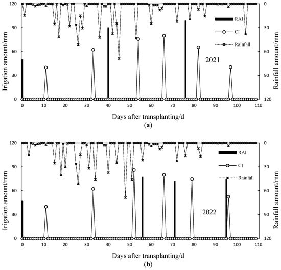 The volume of precipitation and irrigation water under RAI and CI across two cultivation years: (a) 2021 and (b) 2022. (CI and RAI represent conventional flooding irrigation and rainfall-adapted irrigation, respectively).