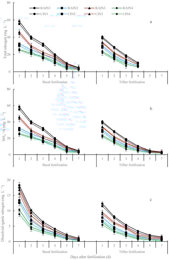 Changes in nitrogen species concentrations in paddy fields surface water under various water and nitrogen management regimes after two nitrogen applications: (a) total nitrogen (TN) concentration; (b) NH4+-N concentration; and (c) dissolved organic nitrogen (DON) concentration. (CI and RAI represent conventional flooding irrigation and rainfall-adapted irrigation, respectively. N1, N2, N3, and N4 represent conventional nitrogen fertilization, reduced nitrogen with CRNF as basal nitrogen fertilizer, deep placement of common urea as basal nitrogen fertilizer, and reduced nitrogen with deep placement of CRNF, respectively. Values represent the average of two experimental years and three replicates).
