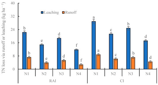 According to Table 2, the TN concentrations in leachate and surface runoff were comparable between CI and RAI. In contrast, the TN concentrations in leachate and surface runoff were greatest under N1 treatment, followed by N2 and N3.