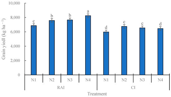 As shown in Figure 4, grain yield was significantly higher under RAI compared to CI, regardless of N treatments. Among all treatments, N1 generated the lowest grain yield under both RAI and CI conditions. In addition, N4 produced a higher grain yield than N2 or N3 under RAI. Notably, the RAIN4 treatment achieved the greatest grain yield, while the CIN1 treatment resulted in the smallest one.