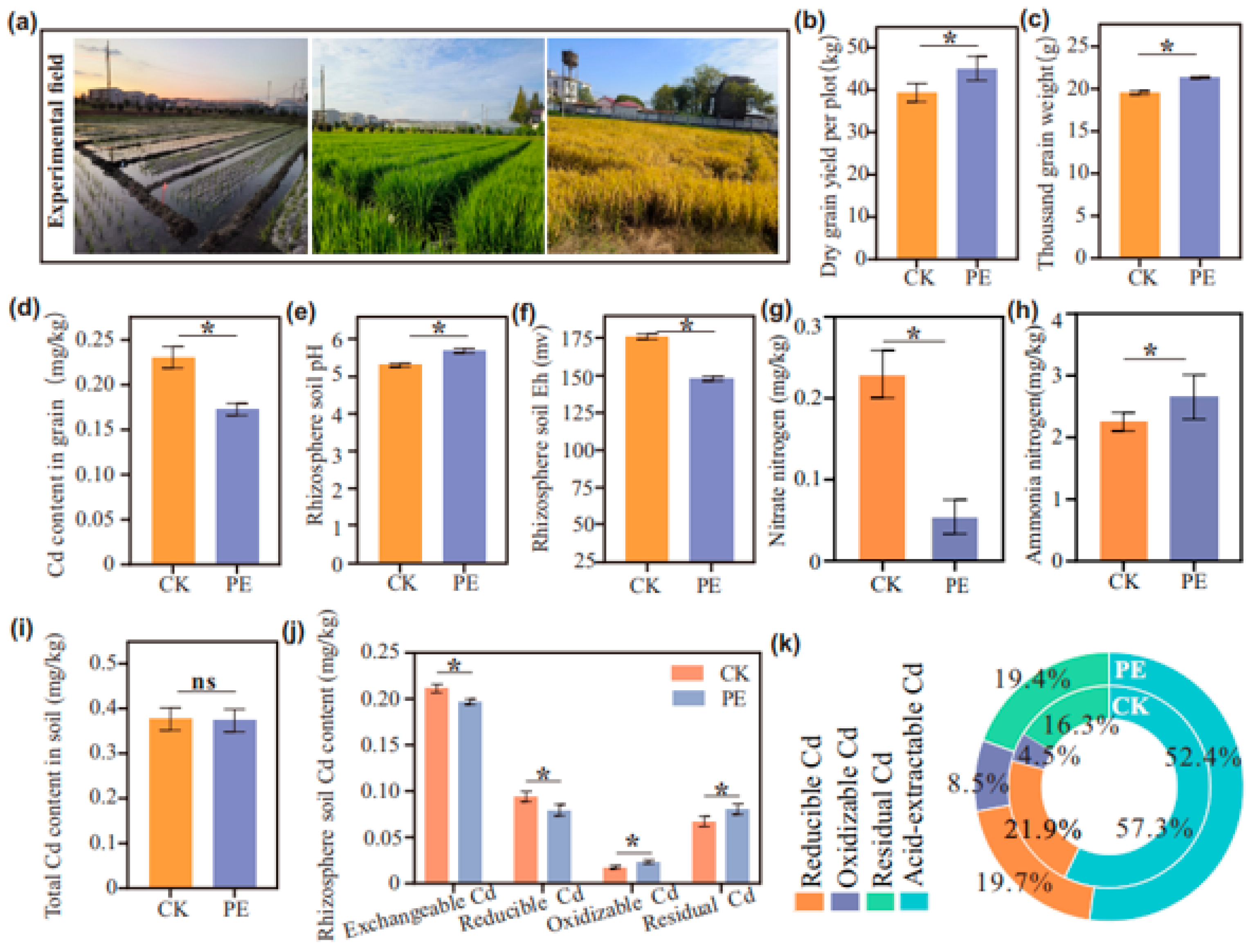 3.1. PE Mulching Reshaped Soil Redox Conditions and Drove Cd Immobilization