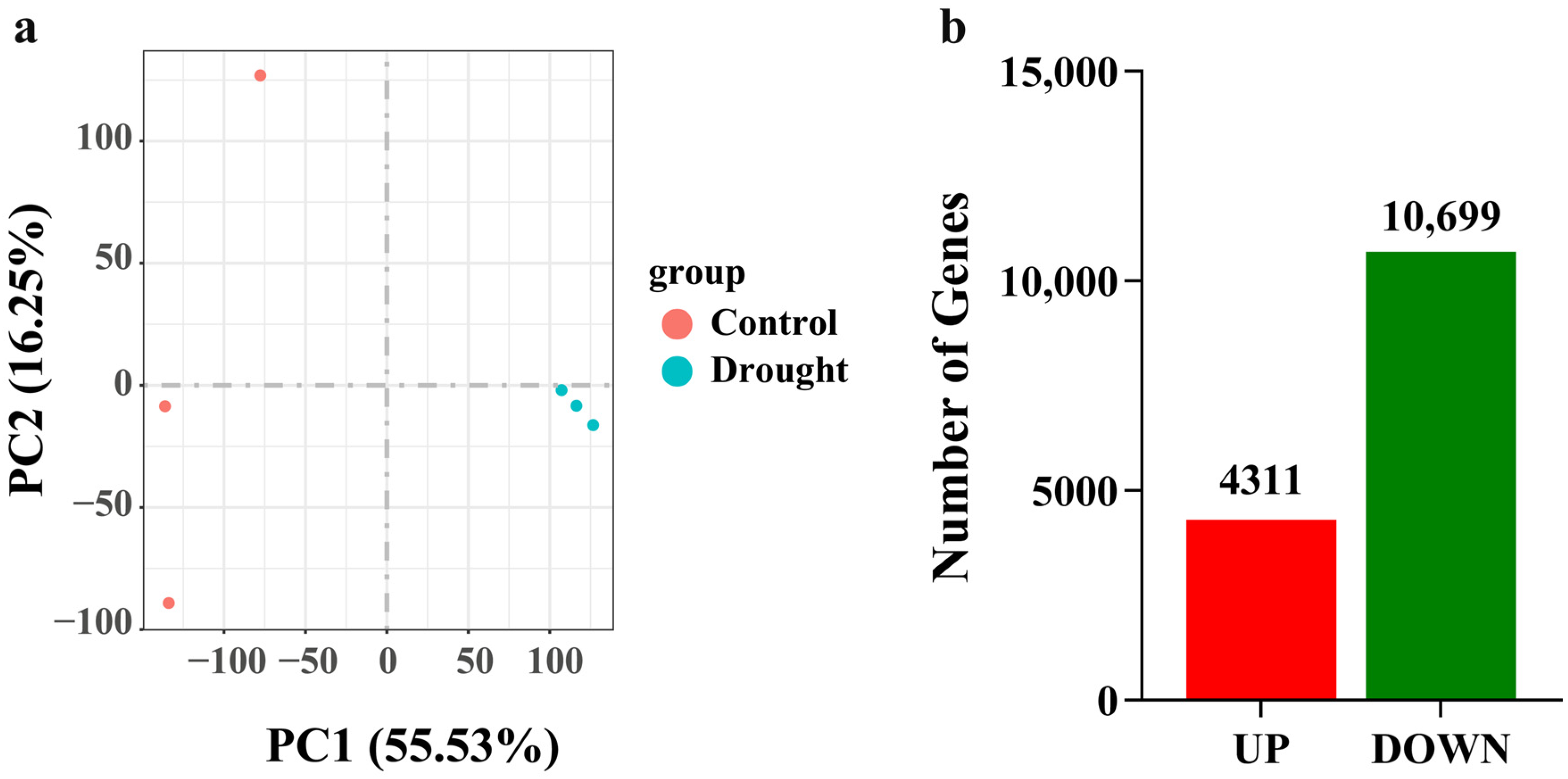 - Li, X.; Zhao, Y.; Gao, C.; Li, X.; Wu, K.; Lin, M.; Sun, W. Integrated analysis of physiological responses and transcriptome of cotton seedlings under drought stress. Int. J. Mol. Sci. 2025, 26, 7824. [Google Scholar] [CrossRef]