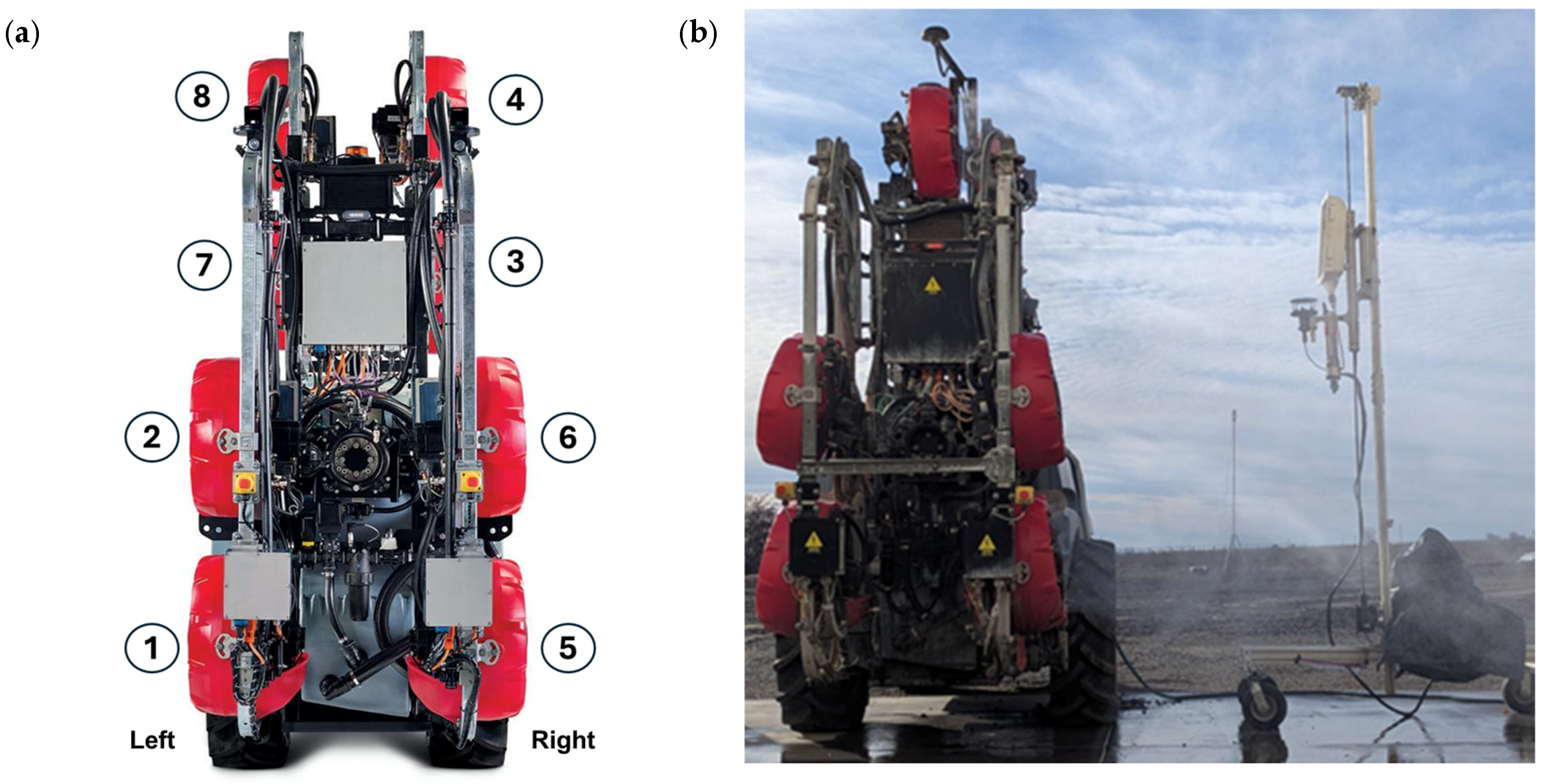 - Hoheisel, G.A.; Bhalekar, D.G.; Gorthi, S.; Khot, L.R. Automated Single-Row Multi-Fan Sprayer Optimization for Efficient Spray Application in Modern Apple Orchards. In Precision Agriculture ′25; Wageningen Academic: Wageningen, The Netherlands, 2025; p. 292. [Google Scholar] [CrossRef]