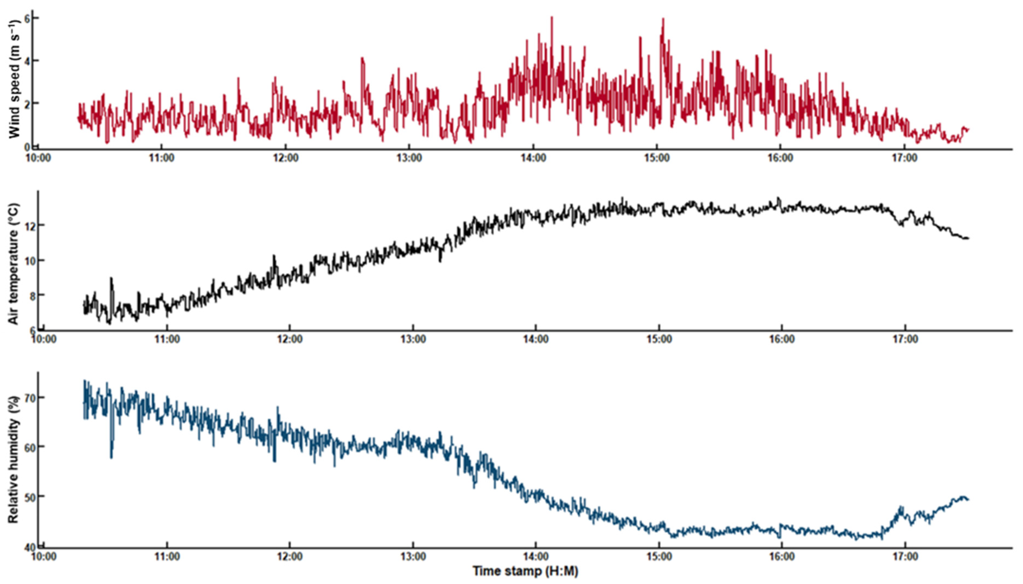 - WindSonic1 2-D Sonic Wind Sensor with RS-232 Output; Product Manual-Campbell Scientific Inc.: Logan, UT, USA, 2025; Available online: https://www.campbellsci.com/windsonic1 (accessed on 22 November 2025).