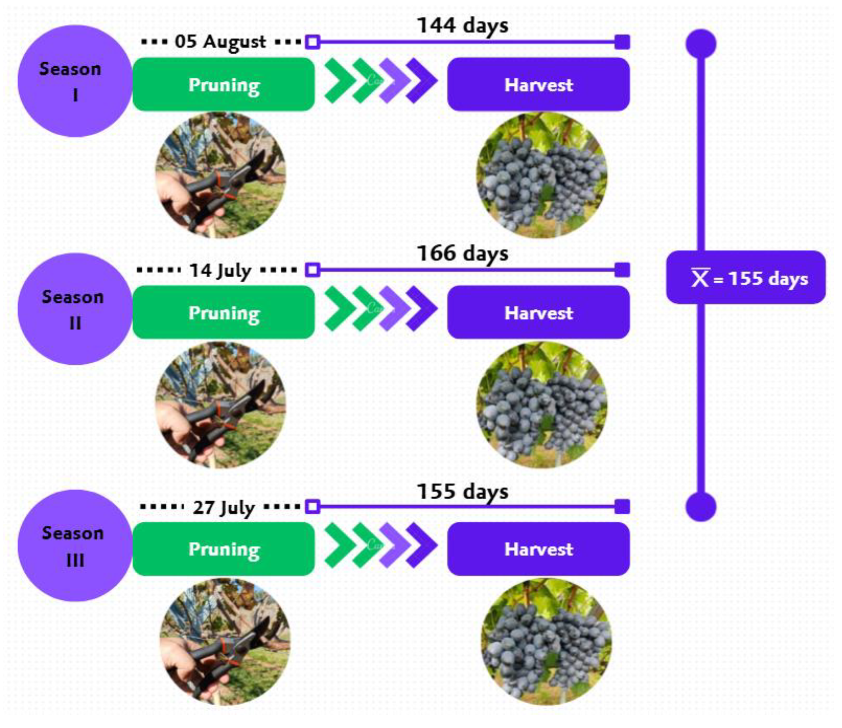 - Rafique, R.; Ahmad, T.; Ahmed, M.; Khan, M.A.; Wilkerson, C.J.; Hoogenboom, G. Seasonal variability in the effect of temperature on key phenological stages of four table grapes cultivars. Int. J. Biometeorol. 2023, 67, 745–759. [Google Scholar] [CrossRef]