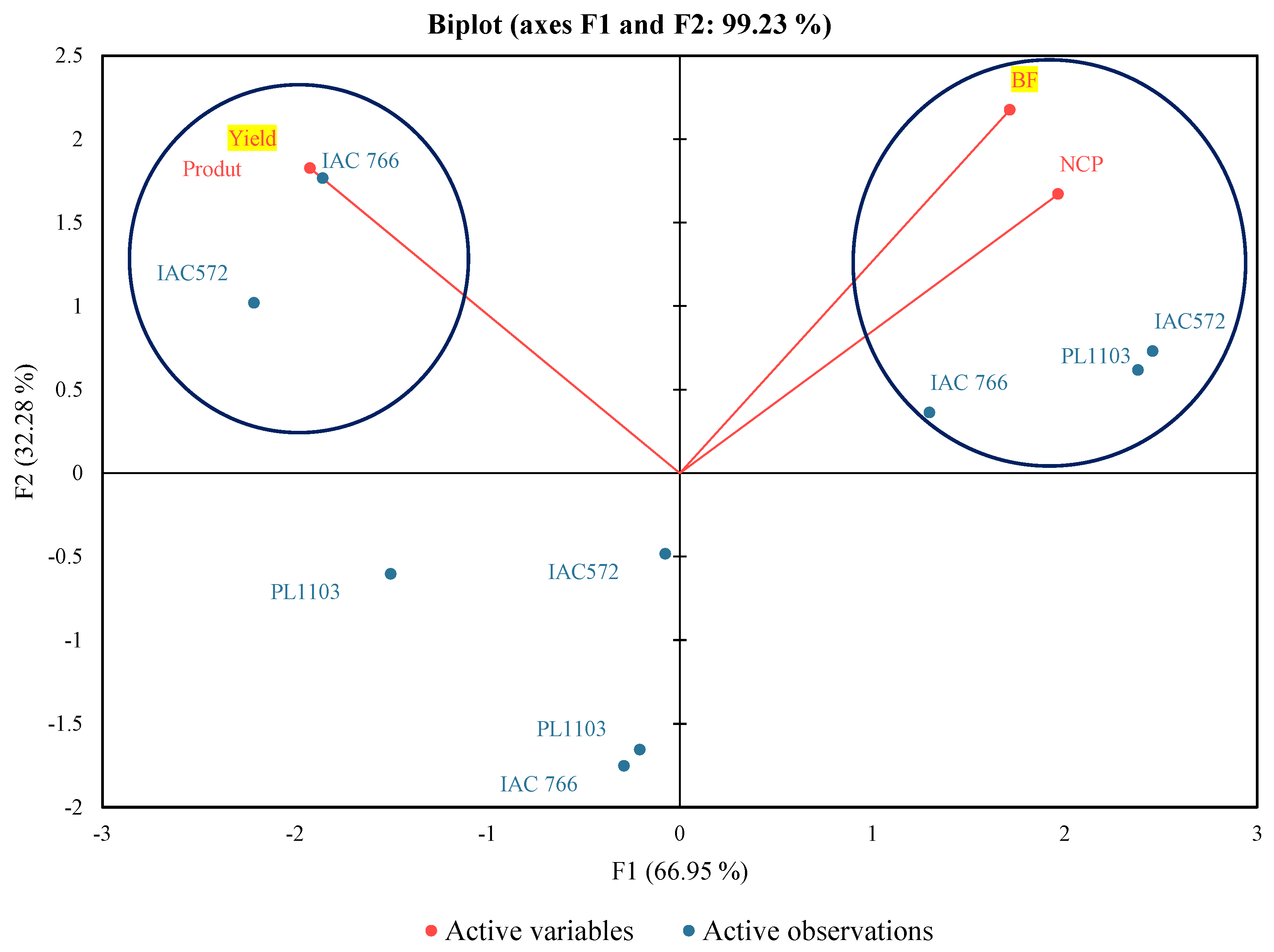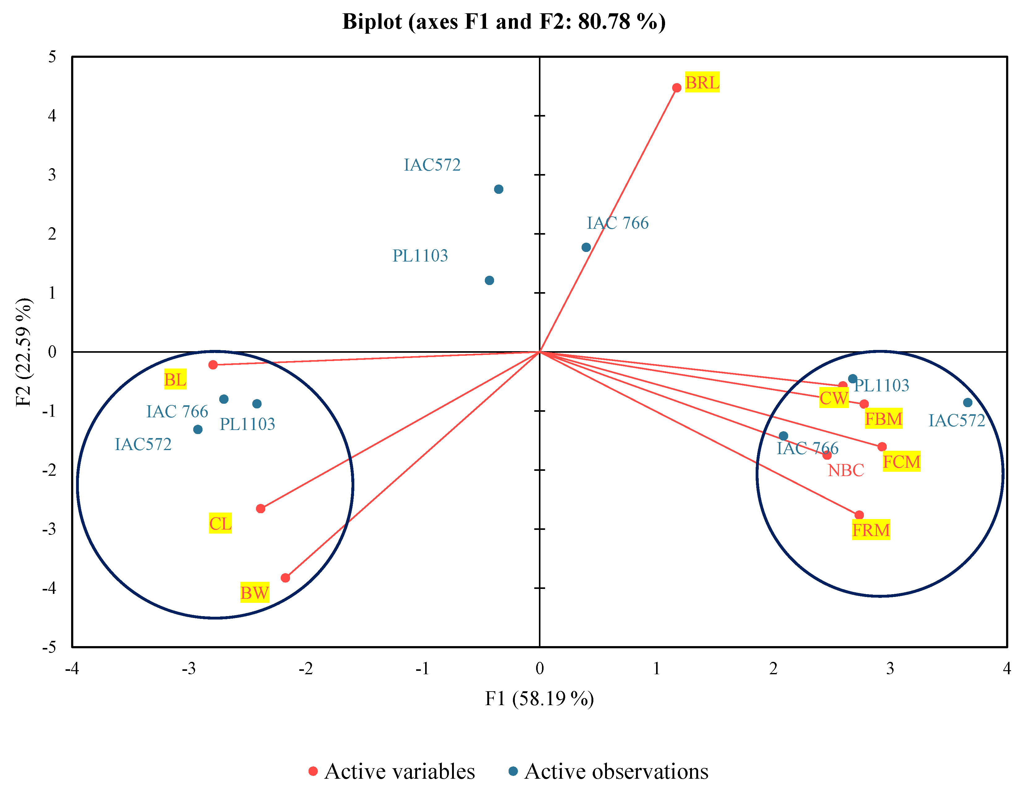 | ‘IAC 766 Campinas’ | 12.4 ± 1.36 | 3.10 ± 0.17 | 2.20 ± 0.24 | 1.41 ± 0.17 | 64.7 ± 12.3 |
