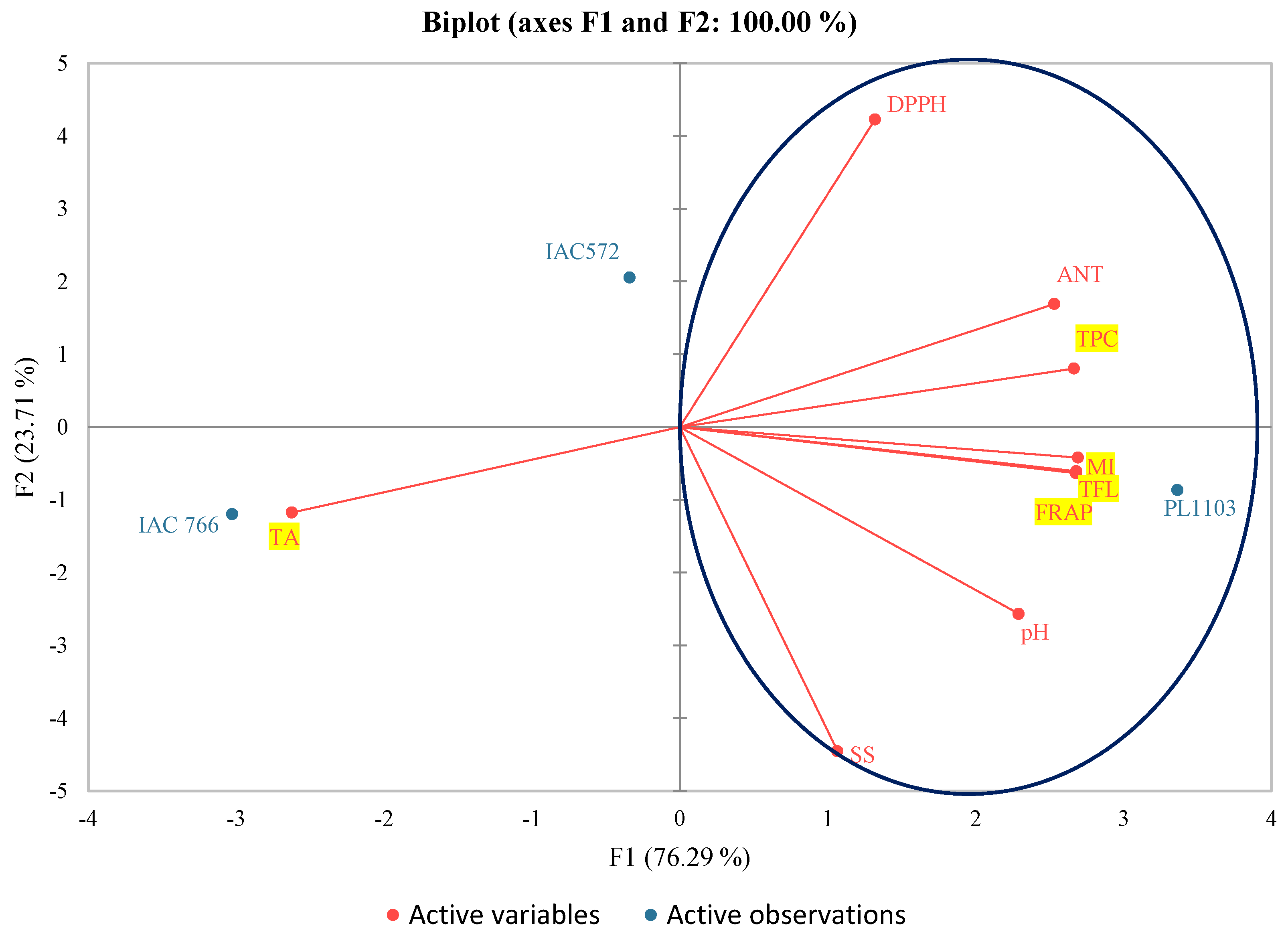 | Bioactive Compounds and Antioxidant Activity | ‘IAC 572 Jales’ | ‘IAC 766 Campinas’ | ‘Paulsen 1103’ | CV (%) |