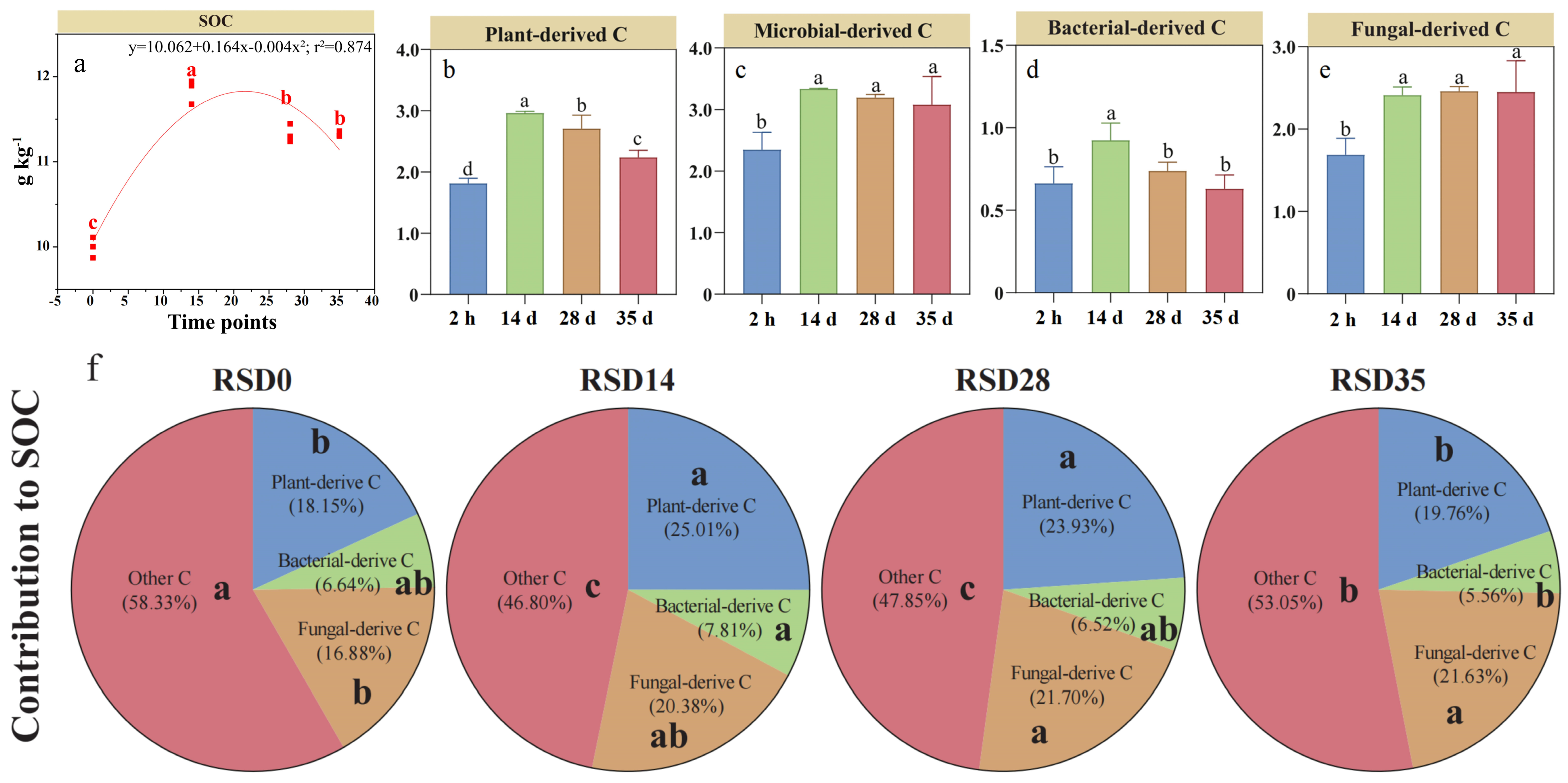 3.3. Dynamics of Microbial- and Plant-Derived C and Their Contributions to SOC During RSD