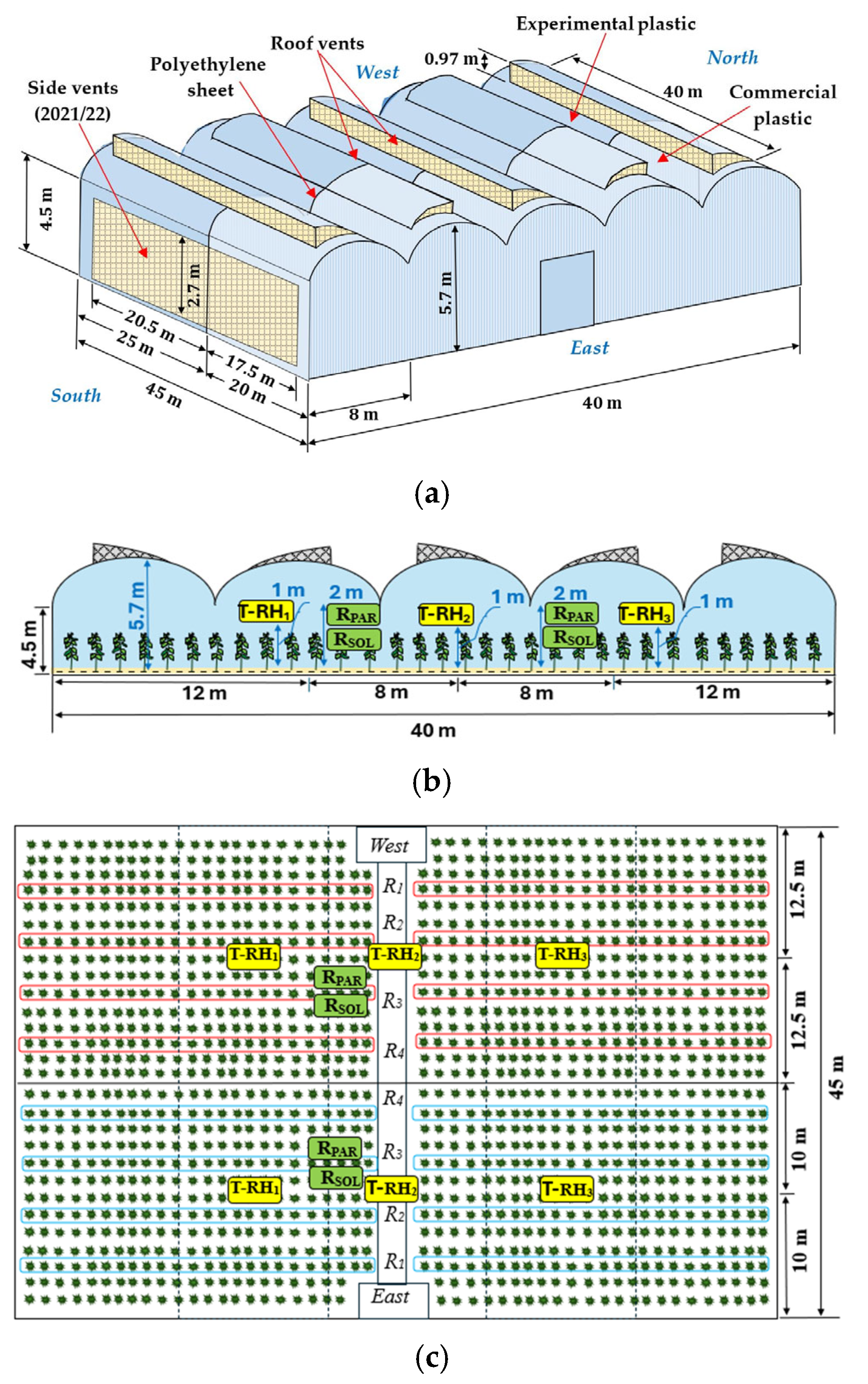 - Papadakis, G.; Briassoulis, D.; Scarascia-Mugnozza, G.; Vox, G.; Feuilloley, P.; Stoffers, J.A. Radiometric and thermal properties of, and testing methods for, greenhouse covering materials. J. Agric. Eng. Res. 2000, 77, 7–38. [Google Scholar] [CrossRef]
