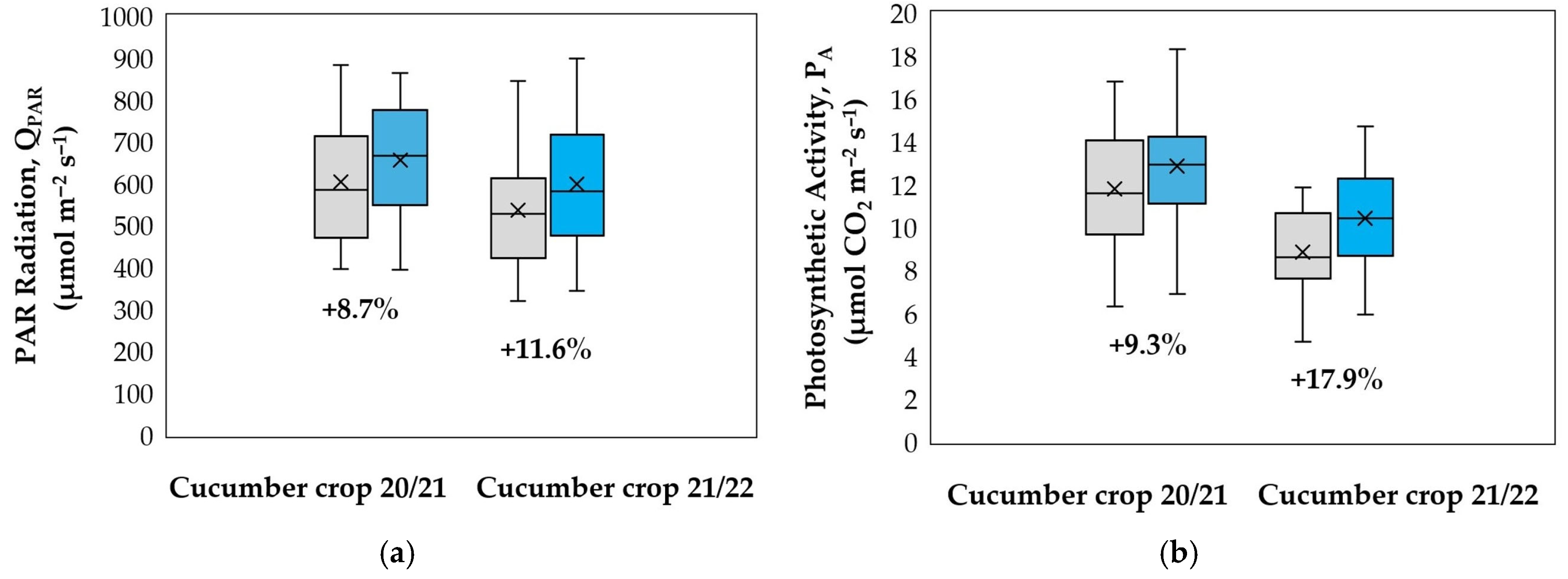 - Ahn, D.; Higashide, T.; Nakano, A.; Kawasaki, Y.; Iwasaki, Y. Influence of light intensity on growth and CO2 assimilation rates of three genotypes of cucumber seedlings grown in chambers. Acta Hortic. 2014, 1037, 759–764. [Google Scholar] [CrossRef]