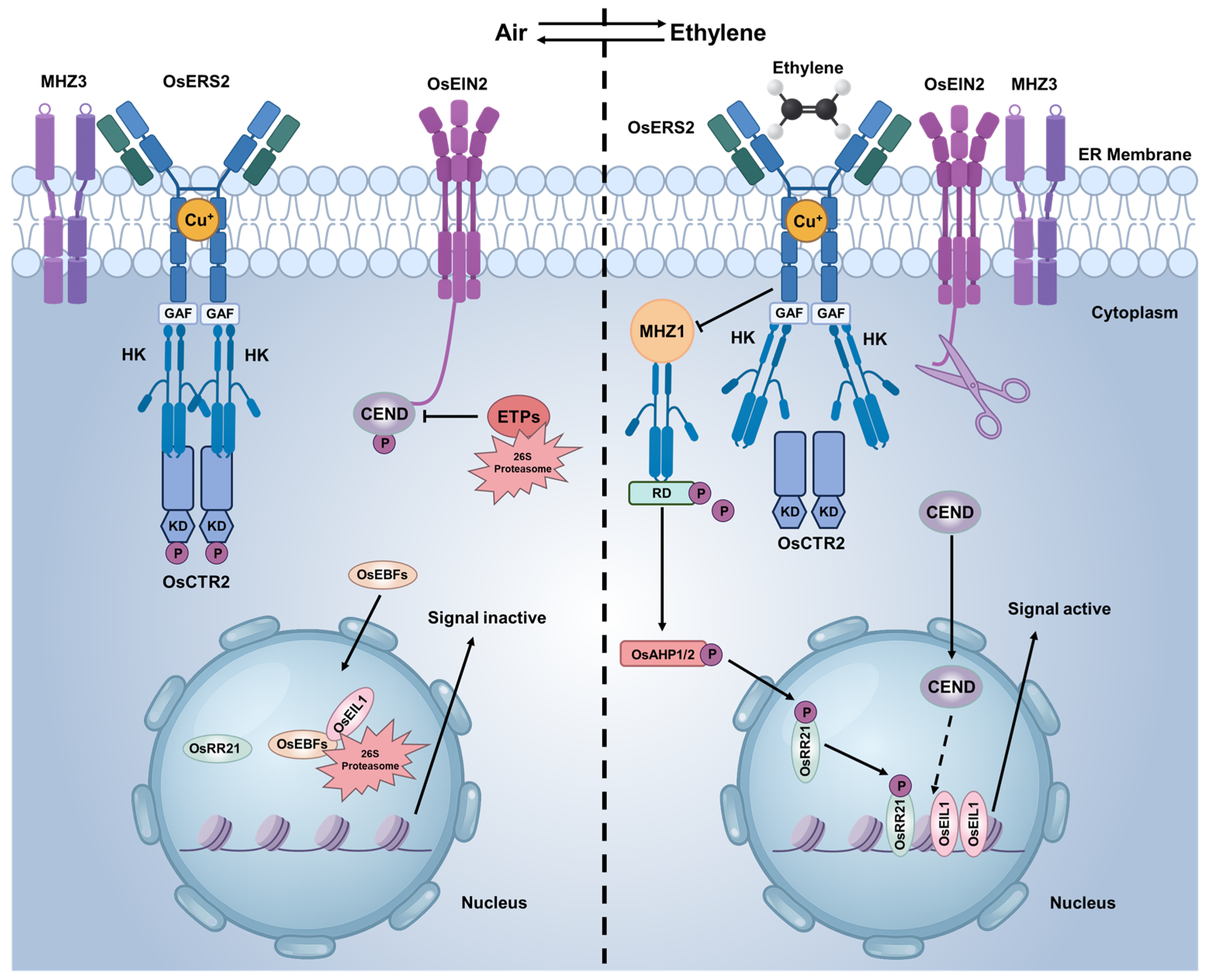 - Li, X.K.; Huang, Y.H.; Zhao, R.; Cao, W.Q.; Lu, L.; Han, J.Q.; Zhou, Y.; Zhang, X.; Wu, W.A.; Tao, J.J.; et al. Membrane protein MHZ3 regulates the on-off switch of ethylene signaling in rice. Nat. Commun. 2024, 15, 5987. [Google Scholar] [CrossRef]