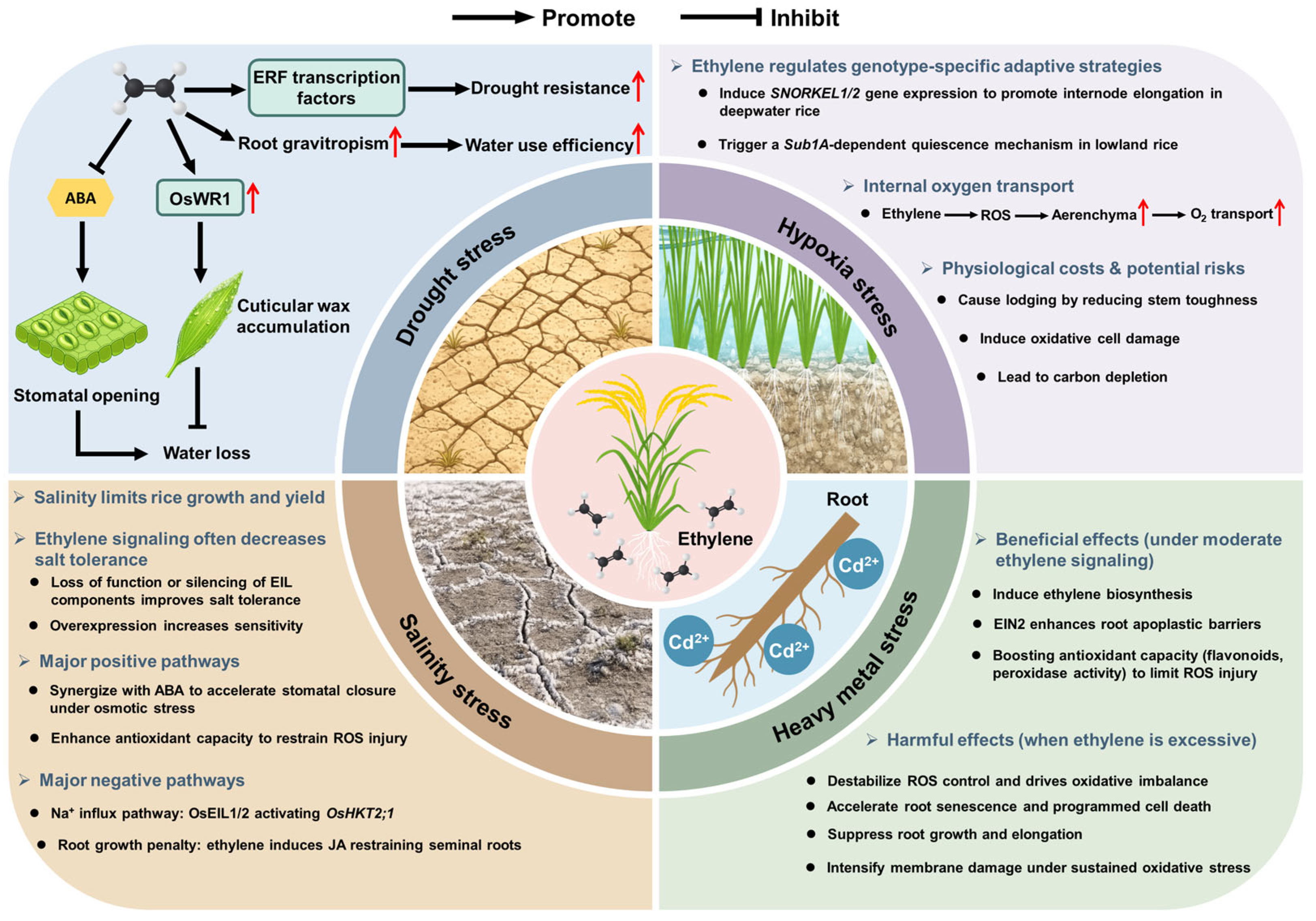 | Salinity | Primarily negative; positive modulation occurs in specific pathways. | Positive: Synergizes with ABA; activates antioxidants; OsDOF15 suppresses OsACS1. Negative: OsEIL1/2 upregulate OsHKT2;1 (Na+ uptake); induces JA. | Adaptive: 1. Alleviates osmotic stress; 2. Mitigates oxidative damage; 3. Maintains root growth via suppressed ethylene biosynthesis. Detrimental: 1. Exacerbates ionic toxicity; 2. Impairs root growth and salt tolerance. | [28,36,65,66,67,68] |