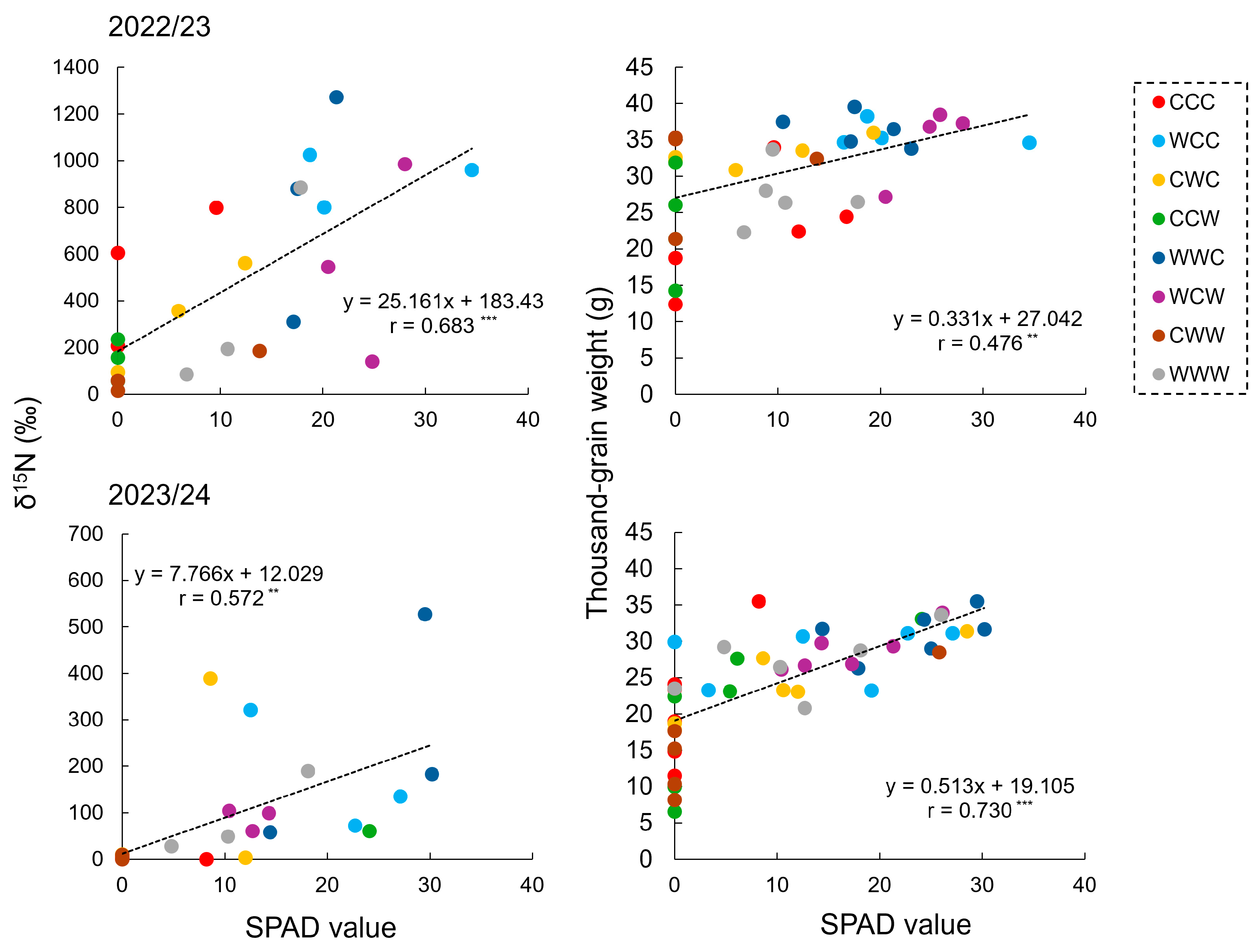 3.5. Correlation Between SPAD and Leaf δ15N or Thousand-Grain Weight