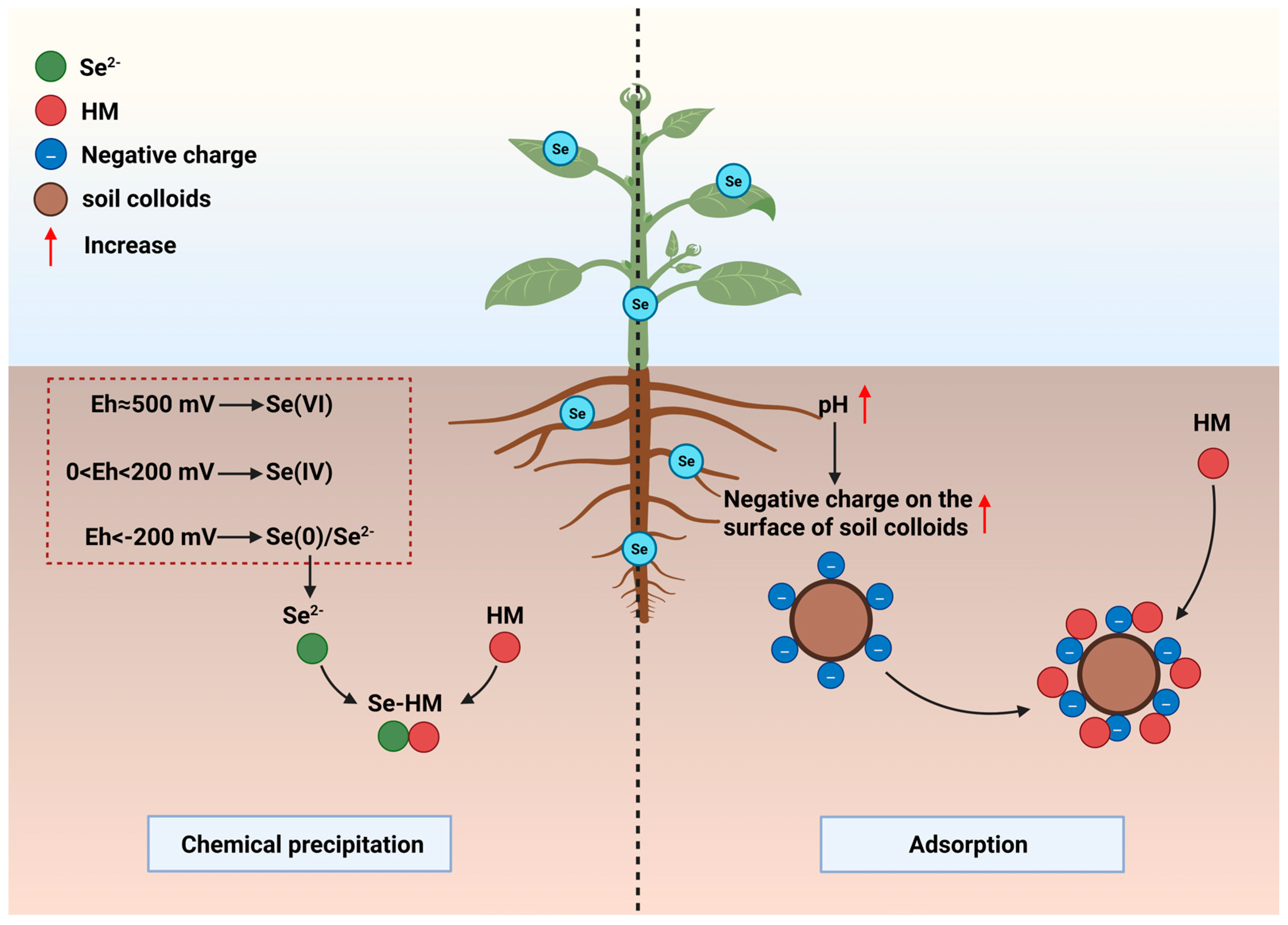 Chemical coprecipitation between Se and HMs is the most fundamental and long-lasting mechanism for Se-mediated HM immobilization, and this process is strictly constrained by the rhizospheric Eh. As a core factor regulating Se speciation transformation, Eh directly determines whether Se can be converted into forms that form precipitates with HMs. Meanwhile, it interacts with soil waterlogging conditions and microbial activities to jointly affect the stability of the precipitates.