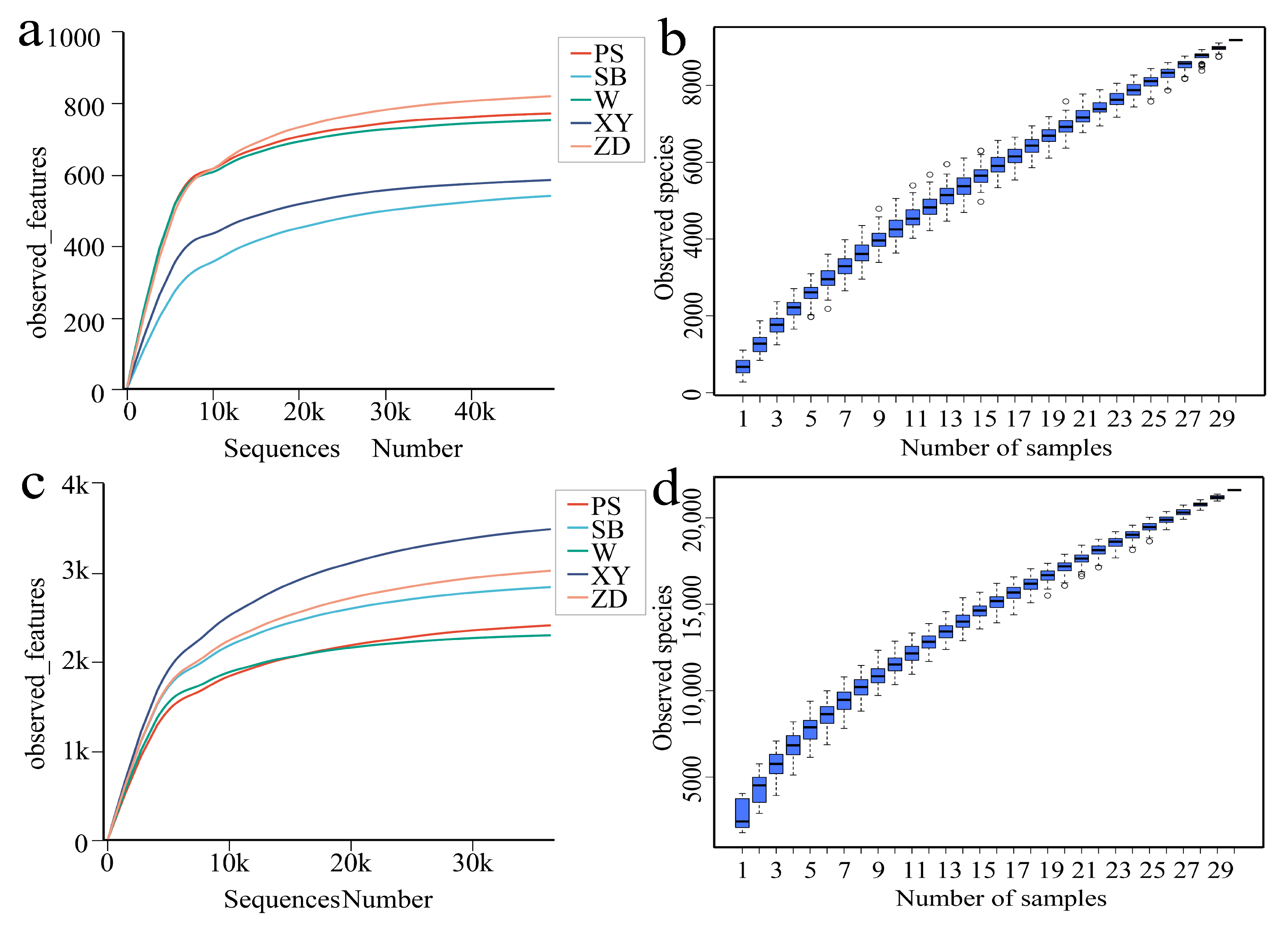 (a) Fungal observed_features rarefaction curve; (b) fungal species accumulation boxplot; (c) bacterial observed_features rarefaction curve; (d) bacterial species accumulation boxplot. In (a,c), the legend entries PS, ZD, XY, W, and SB represent different treatment groups: control soil, ZD958 rhizosphere soil, XY335 rhizosphere soil, W998 rhizosphere soil, and SB13 rhizosphere soil, respectively; the same conventions apply throughout. In (b,d), the horizontal axis represents the number of sequencing samples, and the vertical axis represents the count of feature sequences after sampling.