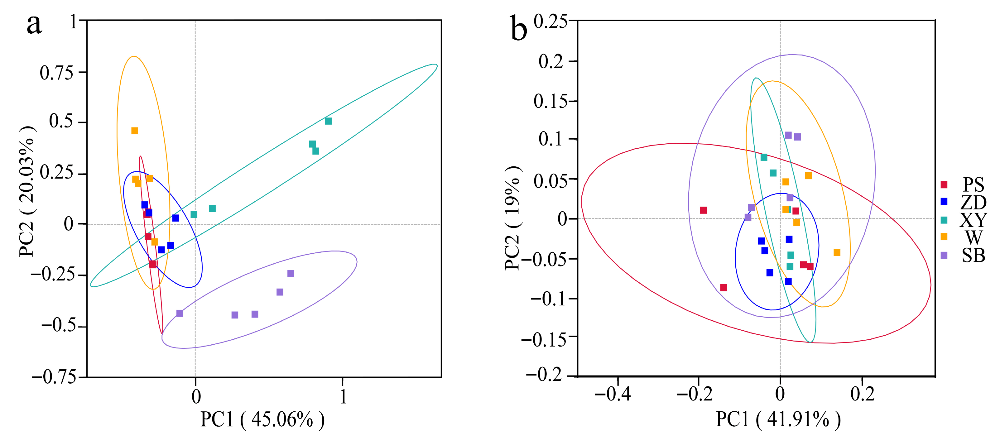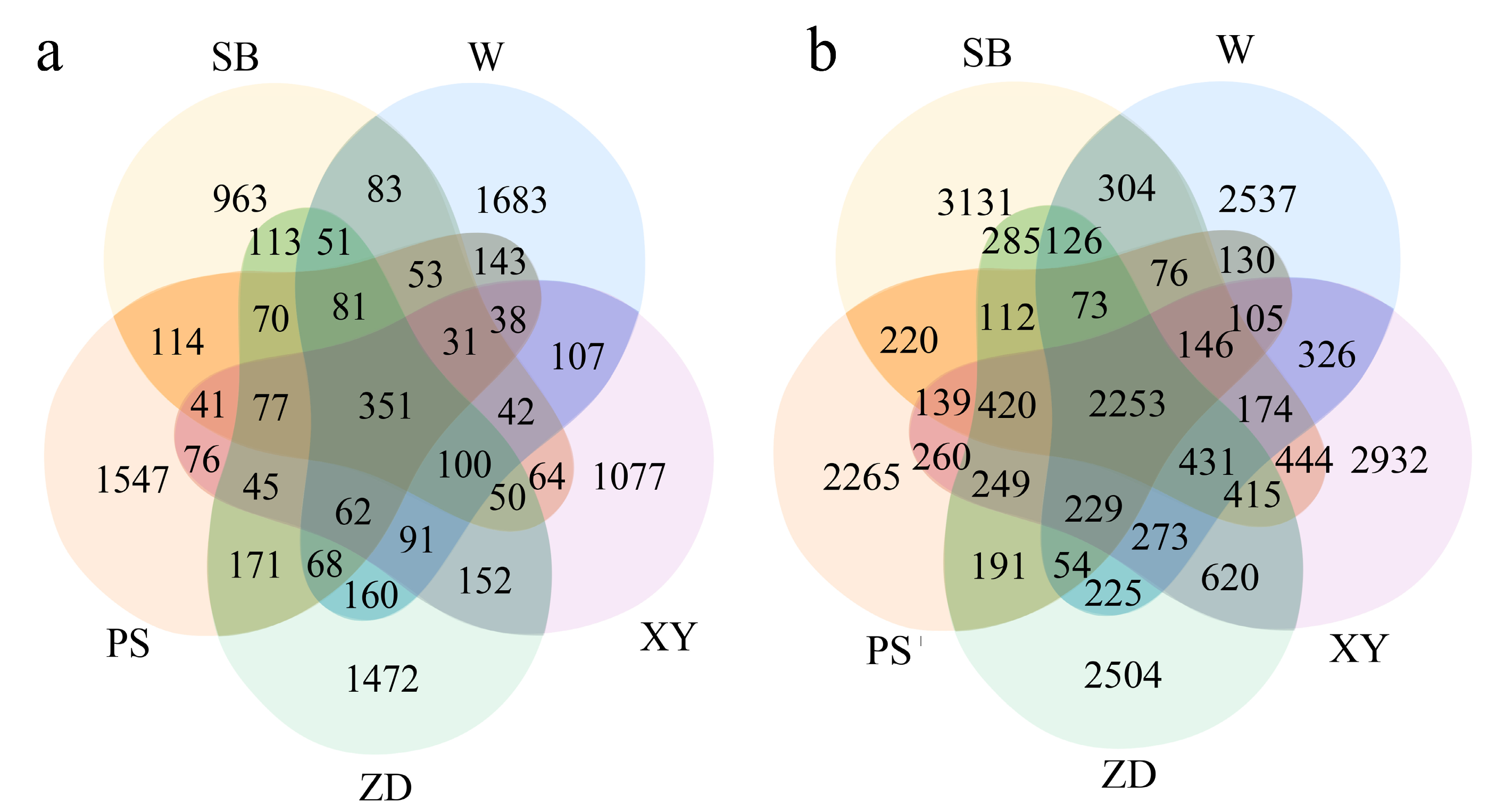 Distribution of soil microbial ASVs: (a) fungal ASVs; (b) bacterial ASVs. In the Venn diagram, each pear-shaped circle represents a treatment group. The number in the central overlapping region indicates the count of feature sequences shared among the treatment groups, while the numbers in the non-overlapping regions indicate the count of feature sequences unique to each respective treatment group. Orange represents the PS group, green represents the ZD group, purple represents the XY group, blue represents the W group, and yellow represents the SB group.
