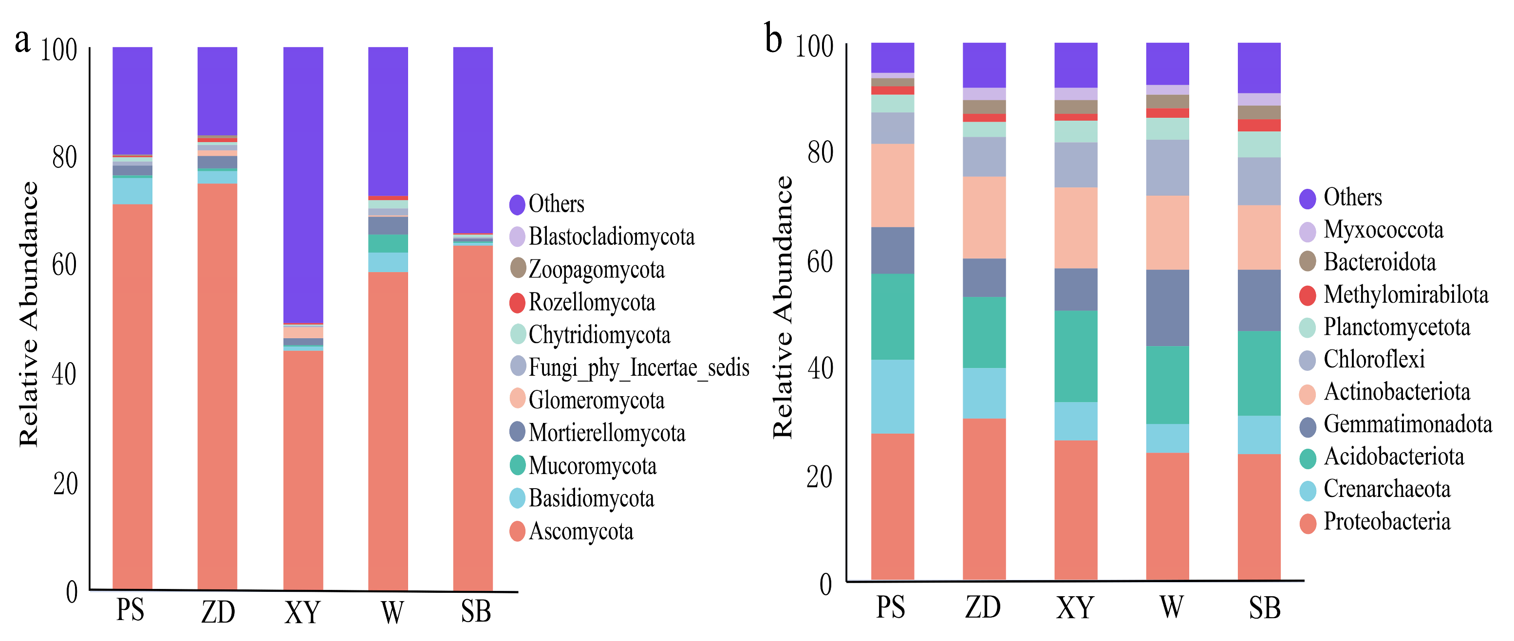 Relative abundance of soil (a) fungal communities and (b) bacterial communities at the phylum level. The horizontal axis represents different treatment groups, and the vertical axis represents relative abundance. The legend displays the 10 most abundant phyla across the treatment groups at the phylum level, where “Others” denotes the sum of relative abundances of all phyla except the ten shown in the figure.