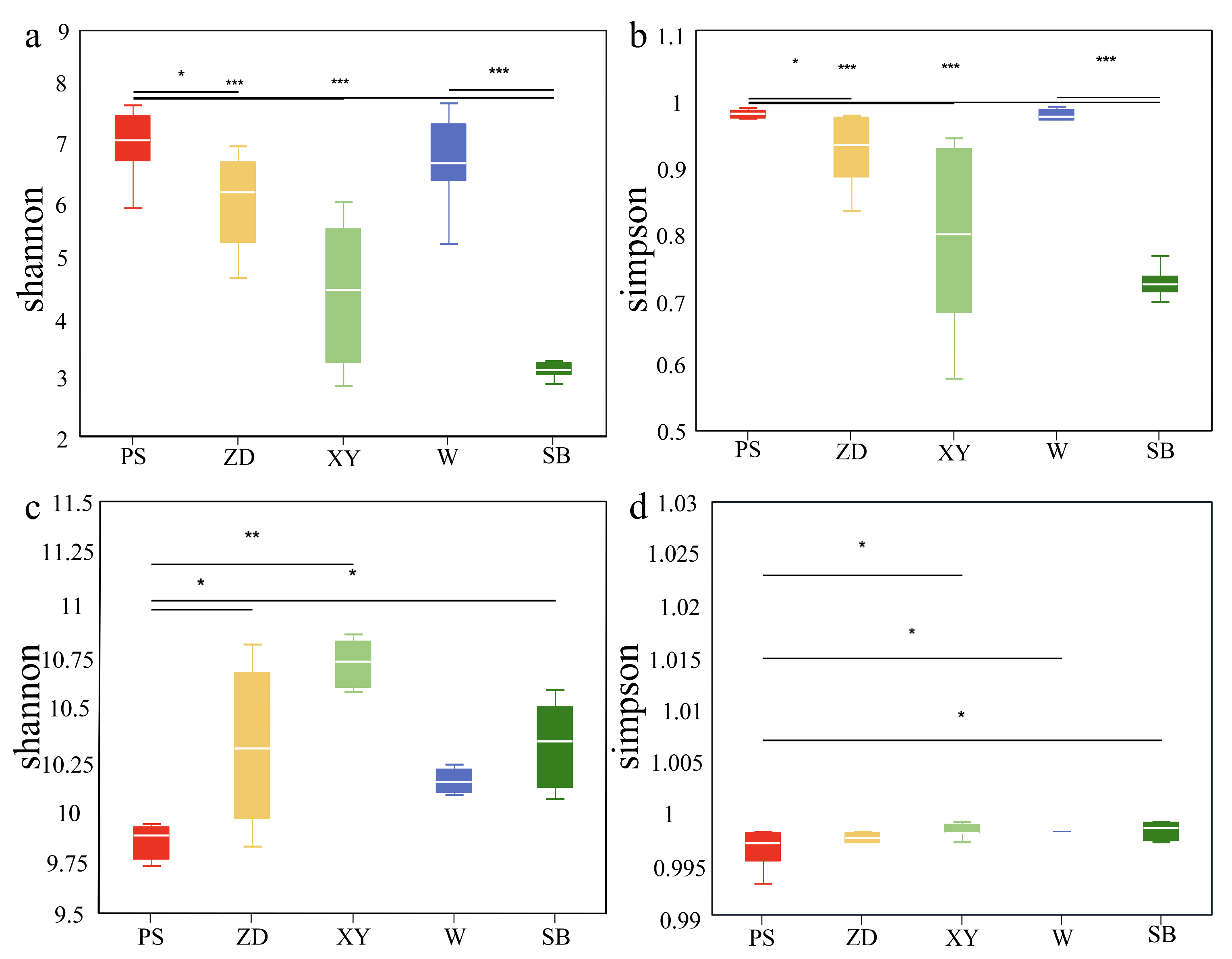 Soil (a,b) fungal alpha diversity indices and (c,d) bacterial alpha diversity indices. The horizontal axis denotes different treatment groups, while the vertical axis represents the alpha diversity index values. The horizontal line at the center of each box indicates the median. The symbols *, **, and *** denote statistical significance levels of p < 0.05, p < 0.01, and p < 0.001, respectively.