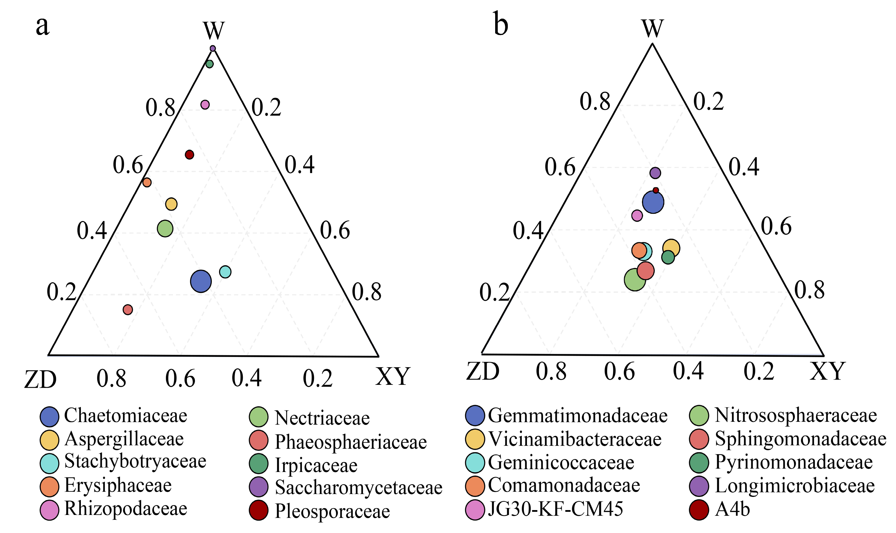 Family-level abundance distribution of soil (a) fungal communities; family-level abundance distribution of soil (b) bacterial communities. The three vertices of the triangle represent the three treatment groups. Different colored circles indicate different species—the closer a circle is to a vertex, the higher the abundance of that species in the corresponding group. The size of each circle corresponds to the relative abundance of the species.