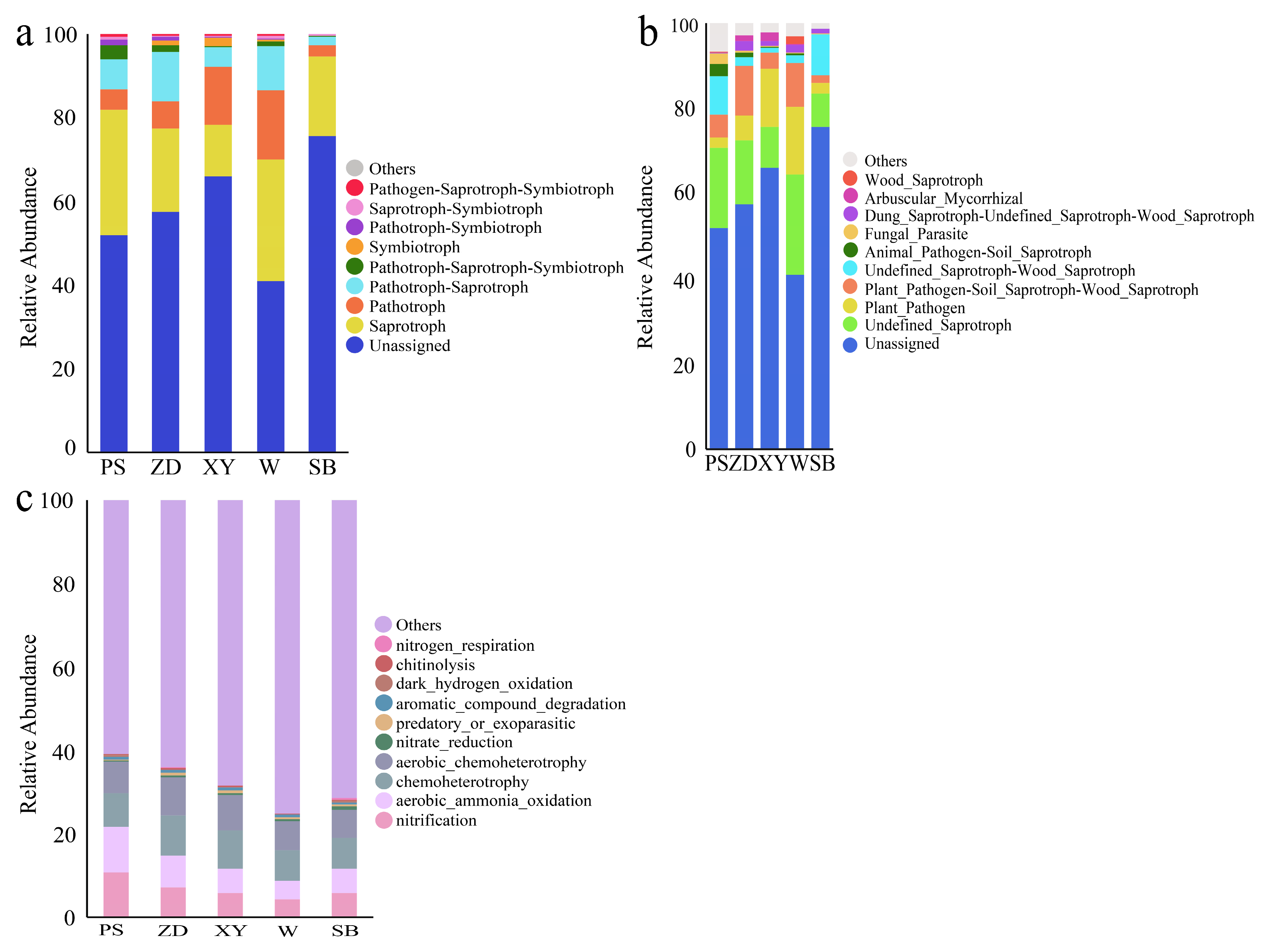 Predicted (a) fungal trophic modes, (b) fungal functional groups, and (c) bacterial functions. The horizontal axis represents the treatment groups, while the vertical axis indicates the relative abundance. In the legend, “Others” denotes the sum of the relative abundances for all functional information not displayed in the figure.