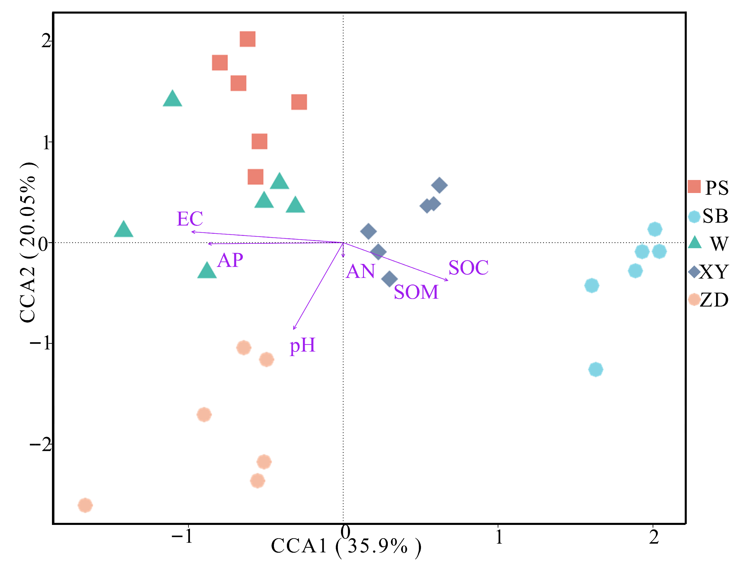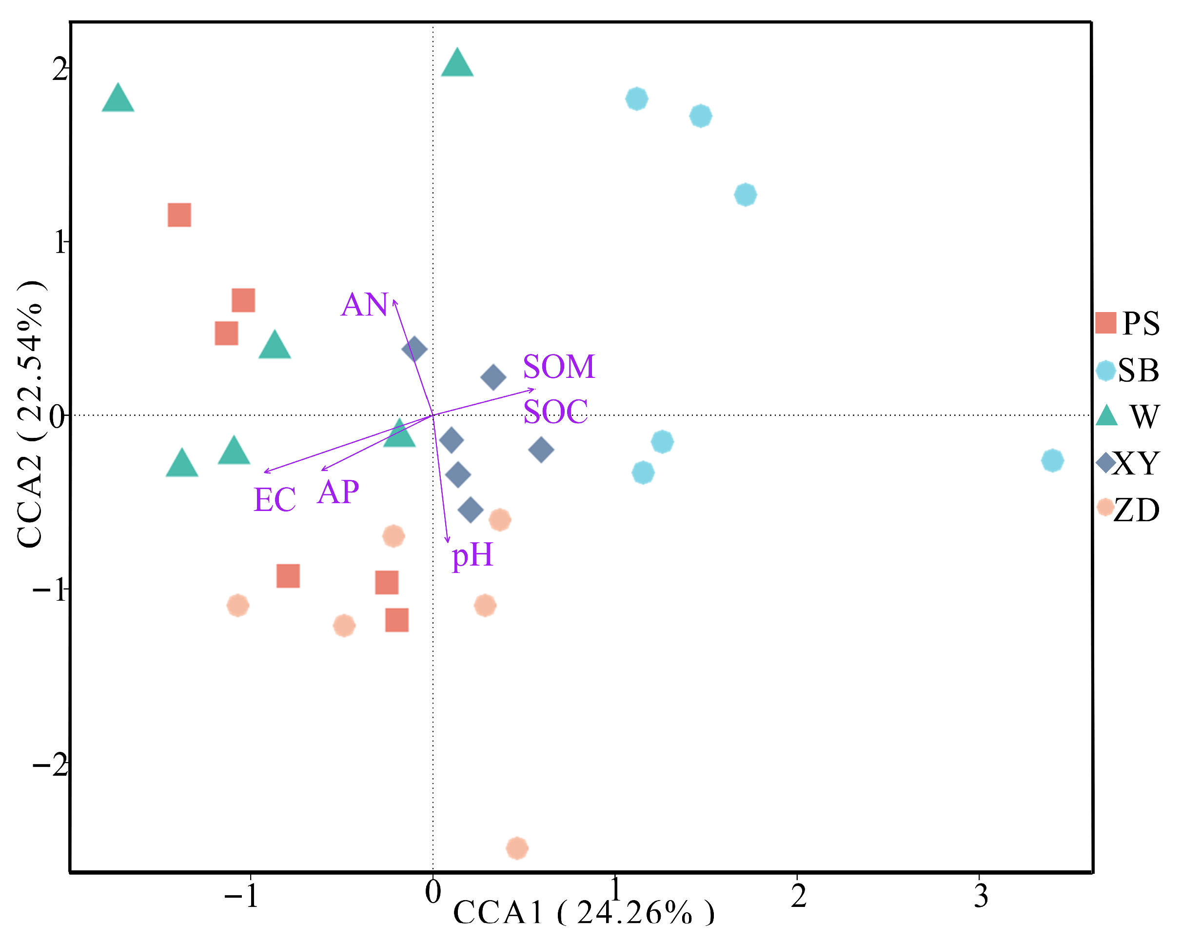 Soil factors and bacterial community structure. The horizontal and vertical axes represent the CCA axes, with the percentages indicating the proportion of variance explained by each axis. pH: soil pH, EC: soil electrical conductivity, AP: available phosphorus, AN: alkali-hydrolyzable nitrogen, SOC: soil organic carbon, SOM: soil organic matter. The legend denotes different treatment groups, and samples belonging to the same treatment group are represented by icons of the same color. In the diagram, purple arrows represent different environmental factors, with arrow length indicating the magnitude of their influence.